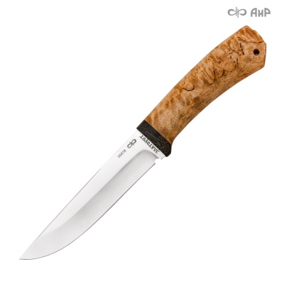 Рукоять изготовлена из карельской берёзы — прочного и красивого материала с выразительной природной текстурой. Она удобно ложится в руку, подходит для ладоней любого размера и обеспечивает уверенный хват. Гарда средней величины защищает пальцы, а отверстие под темляк на навершии добавляет практичности. Конструкция ножа — сквозной неразборный монтаж, гарантирующий долговечность.