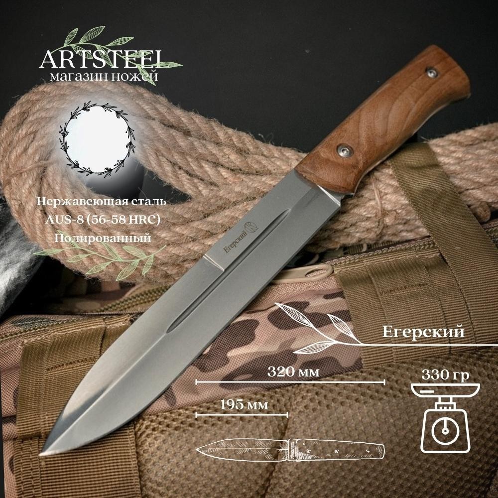 Ореховое дерево, из которого выполнена рукоять туристического ножа Егерский, имеет привлекательный внешний вид со своей уникальной текстурой и узорами. Из особенностей ножа можно отметить начилие отверстия под темляк на рукояти. Конструкция сплошная, хвостовик проходит через всю рукоять.