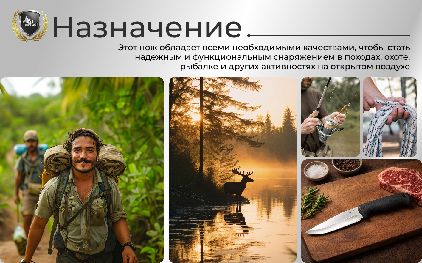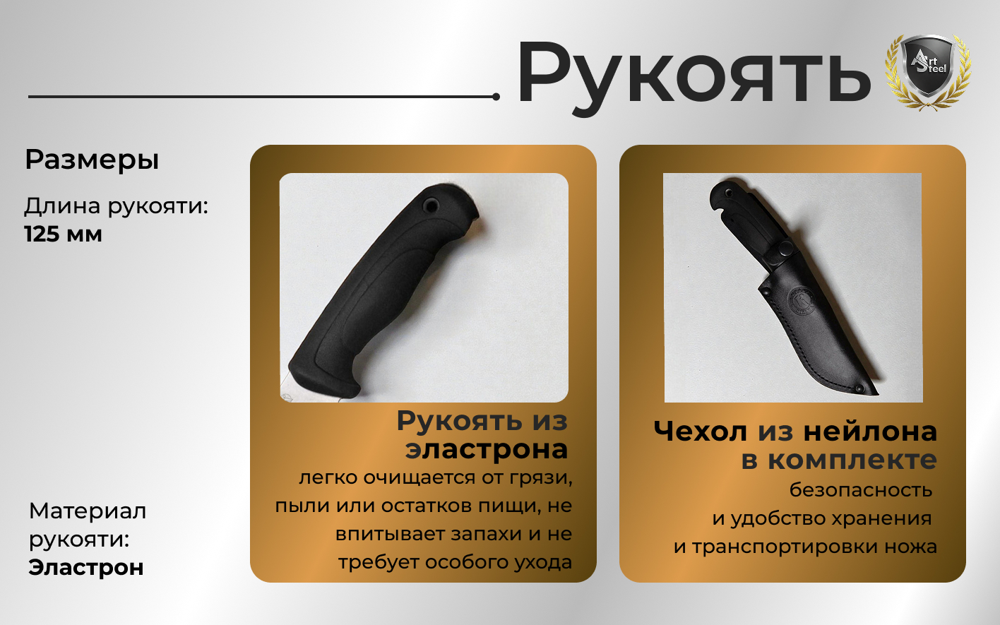 Эластроновая рукоять обеспечивает надежное и безопасное удержание ножа в руке даже при интенсивном использовании или в сложных условиях. Она легко очищается от грязи, пыли или остатков пищи, не впитывает запахи и не требует особого ухода, что делает обслуживание ножа простым и удобным. Рукоять из эластрона будет служить долгое время, обеспечивая надежную поддержку и прочность.