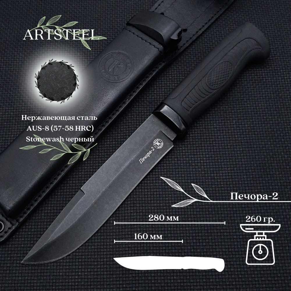Японская нержавеющая сталь AUS8, из которой выполнен клинок охотничьего ножа Печора-2, имеет несколько преимуществ. Во-первых, она отличается высокой коррозионной стойкостью и устойчивостью к повреждениям, что делает ее идеальным материалом для ножей, используемых на открытом воздухе. Во-вторых, сталь AUS8 обладает оптимальной твердостью, что позволяет надолго сохранить остроту и прочность клинка. Твердость в 56-58 HRC считается оптимальной для большинства ножей. Она обеспечивает клинку достаточную прочность и устойчивость к деформации, при этом позволяя легко заточить клинок и поддерживать остроту ножа в течение долгого времени. Форма клинка Clip-point - это одна из наиболее распространенных форм клинков ножей. Её особенностью является специальная выемка со стороны обуха, которая создает острый кончик и облегчает выполнение точных задач, таких как прокалывание и разделка. Вогнутые спуски позволяют лезвию легче проникать в материалы и обеспечивают более точный и ровный рез. Обработка Blackwash, или Stonewash черный придаёт клинку черный матовый цвет, и помогает скрыть царапины и другие следы повреждений после эксплуатации.