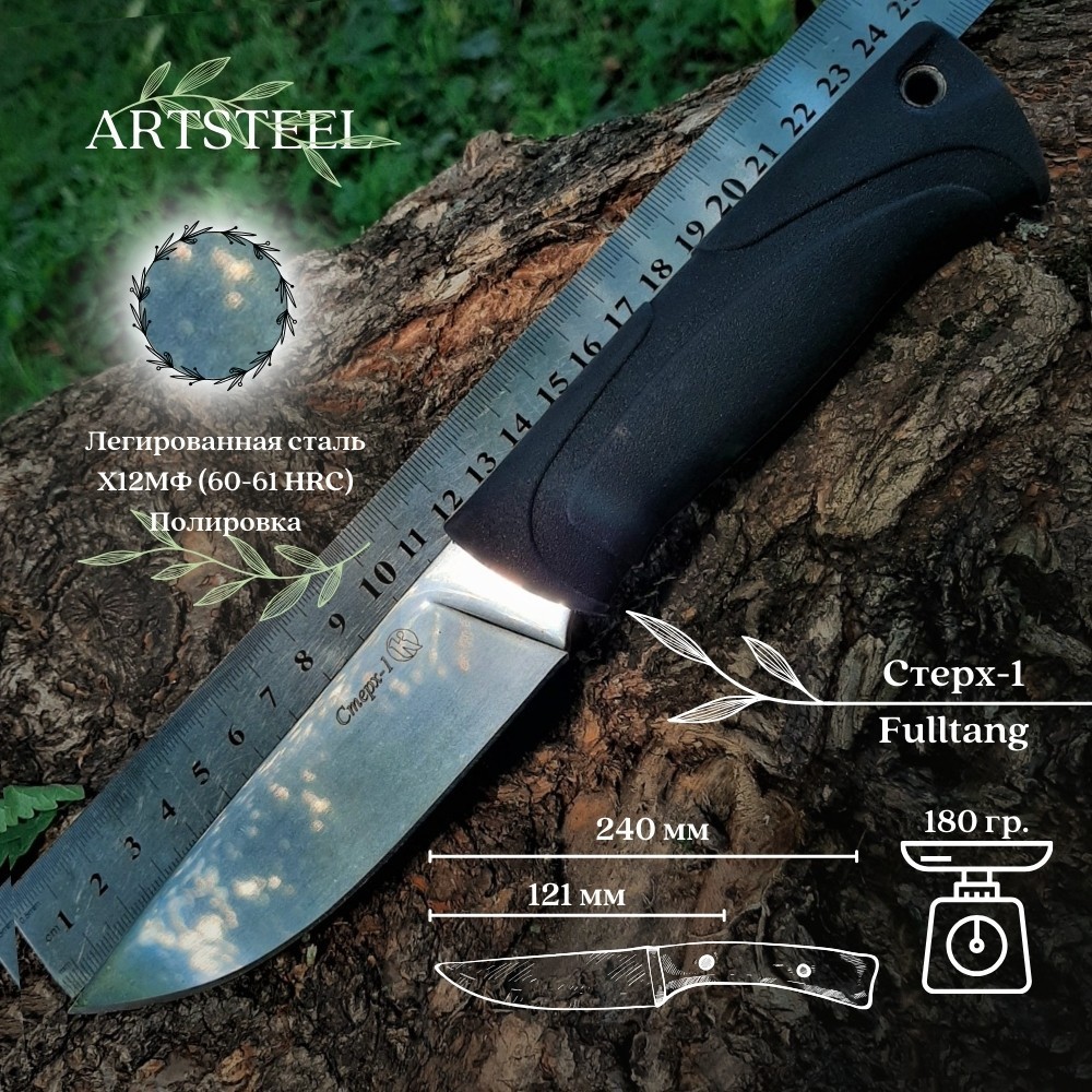 Нож выполнен из инструментальной легированной стали Х12МФ. К основным особенностям ножа из данной стали можно отнести хорошую обрабатываемость клинка, достаточно демократичную стоимость, высокий уровень режущих свойств, минимальный уход за ножом. Твердость 60-61 единицы по Роквеллу позволяет ножу долго держать заточку. Прямая заточка - это классическая и универсальная форма заточки, которая обеспечивает отличную режущую способность и простоту ухода за ножом.