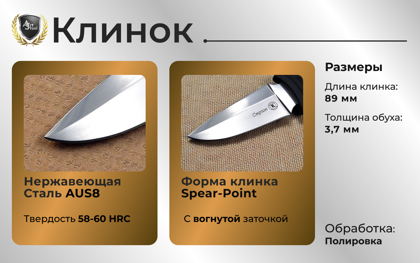 Клинок туристического ножа Страж выполнен из японской нержавеющей стали AUS8. Сталь обладает оптимальным соотношением гибкости и твердости в 58-60 HRC, отличными режущими свойствами, высокой коррозионной стойкостью и устойчивостью к механическим повреждениям. Ножи с клинками из AUS-8 не требуют частой заточки, для них пригодны большинство марок абразивов и подручных средств, не требующих специальных навыков. Клинок профиля Spear point выглядит как кинжал, имеет симметричную форму с острым кончиком, что обеспечивает удобство использования как для правшей, так и для левшей. Это делает его универсальным при эксплуатации. Вогнутые спуски часто встречаются на разделочных и охотничьих ножах. Клинок с вогнутыми спусками имеет тонкий острый край, обеспечивающий отличную режущую способность. Полированный клинок выглядит очень элегантно и привлекательно: гладкая и блестящая поверхность придает ножу роскошный, профессиональный вид.