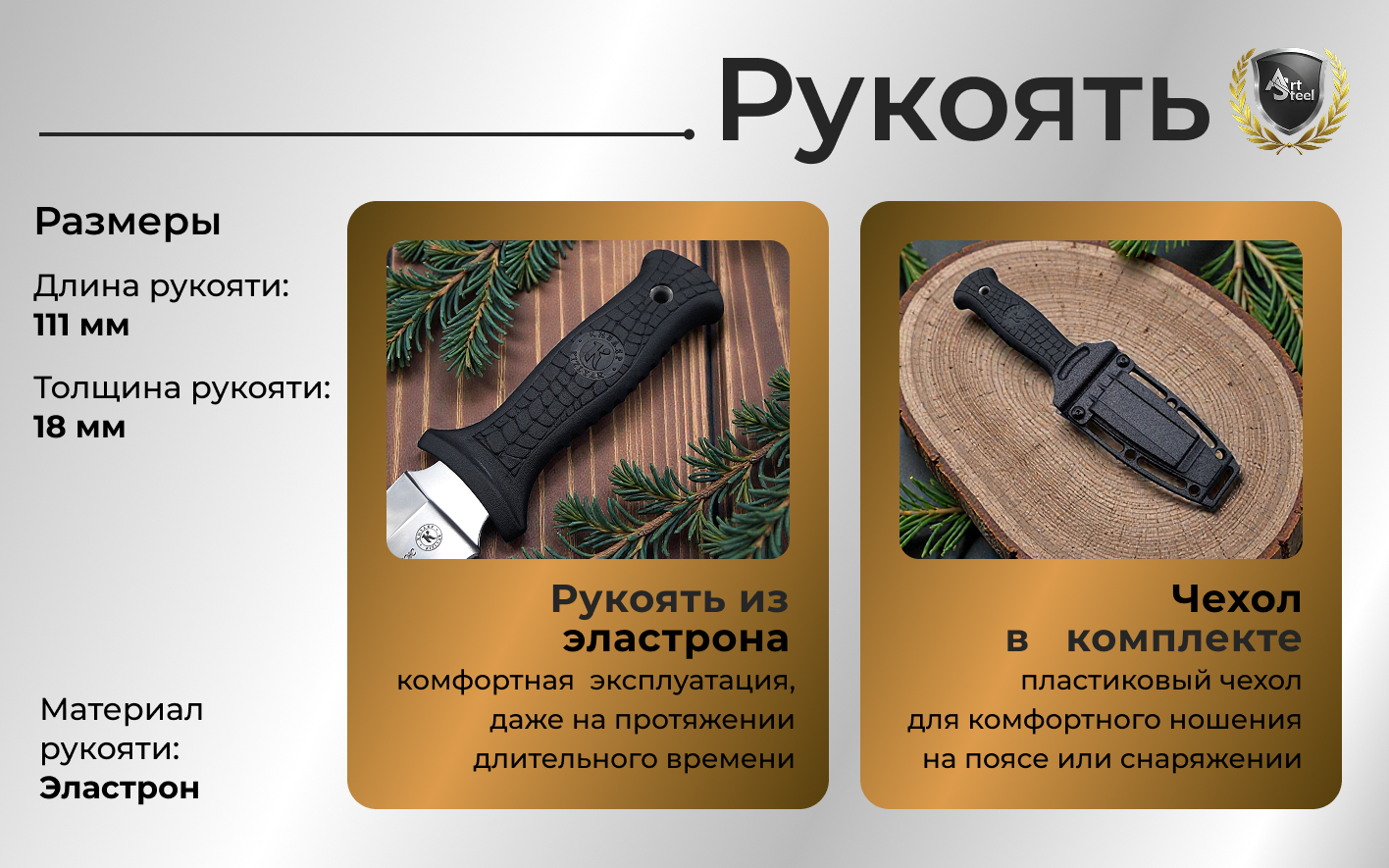 Рукоять ножа изготовлена из эластрона. Эластрон обладает высокой устойчивостью к ударам и износу, что делает его надежным и долговечным материалом для различного применения. Материал способен выдерживать интенсивное использование и сохранять свои характеристики даже при повышенных нагрузках.