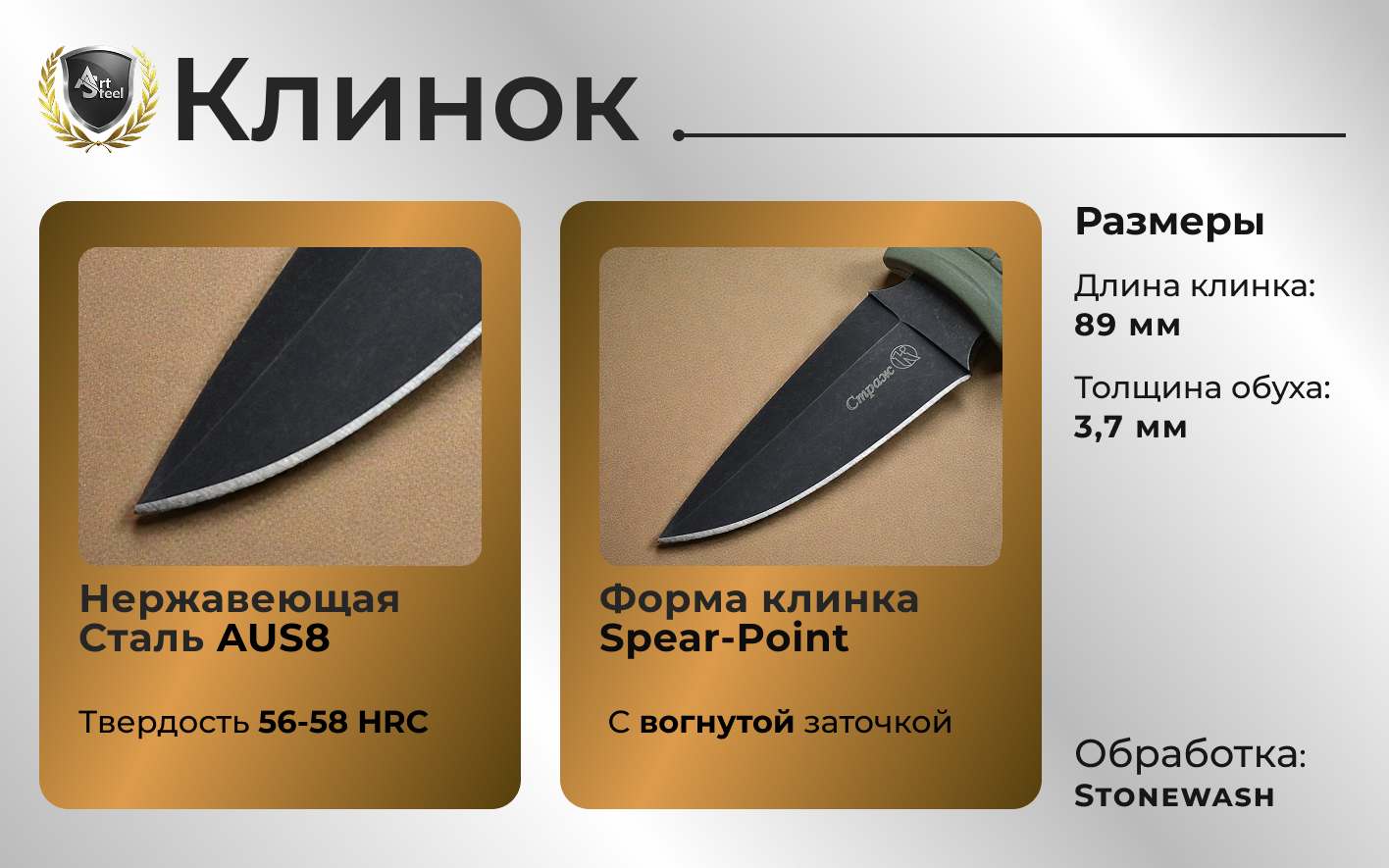 Клинок туристического ножа Страж выполнен из японской нержавеющей стали AUS8. Сталь обладает оптимальным соотношением гибкости и твердости в 56-58 HRC, отличными режущими свойствами, высокой коррозионной стойкостью и устойчивостью к механическим повреждениям. Ножи с клинками из AUS-8 не требуют частой заточки, для них пригодны большинство марок абразивов и подручных средств, не требующих специальных навыков. Клинок с формой Spear point (кинжальная) имеет симметричную форму, сходную к центральной оси клинка. Это придает ему отличную остроту и проникающую способность. Благодаря характерной форме спусков, ножи с вогнутой линзой прекрасно подходят для вспарывания шкуры и разделки мягких тканей, что делает их идеальными для работ с материалами, требующими точного и контролируемого разреза. Обработка Blackwash, или Stonewash черный придаёт клинку черный матовый цвет, и помогает скрыть царапины и другие следы повреждений после эксплуатации.