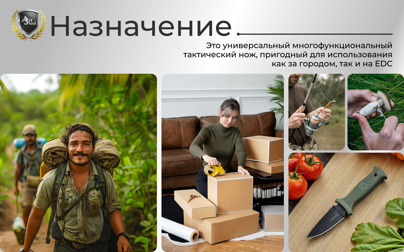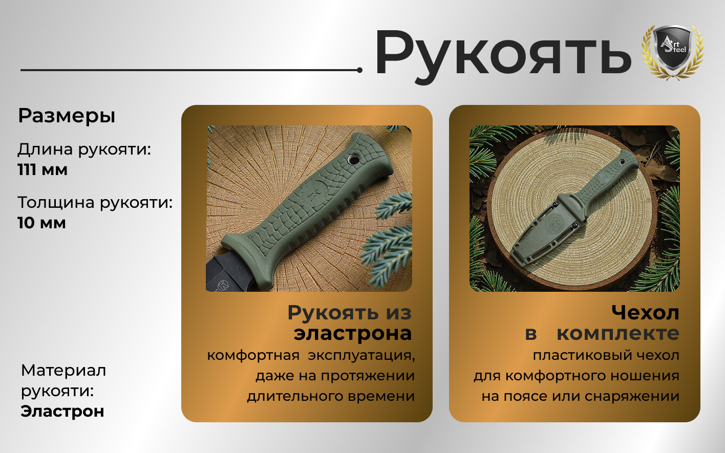 Эластроновая рукоять обеспечивает надежное и безопасное удержание ножа в руке даже при интенсивном использовании или в сложных условиях. Она легко очищается от грязи, пыли или остатков пищи, не впитывает запахи и не требует особого ухода, что делает обслуживание ножа простым и удобным. Рукоять из эластрона будет служить долгое время, обеспечивая надежную поддержку и прочность.