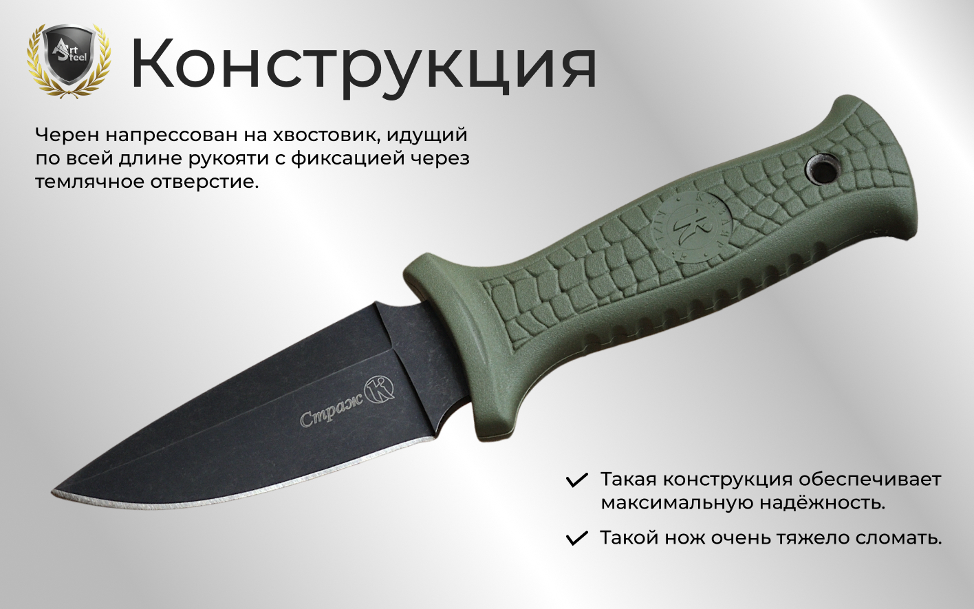 Рукоять ножа изготовлена из эластрона. Эластрон обладает высокой устойчивостью к ударам и износу, что делает его надежным и долговечным материалом для различного применения. Материал способен выдерживать интенсивное использование и сохранять свои характеристики даже при повышенных нагрузках. Конструкция ножа: черен напрессован на хвостовик, идущий по всей длине рукояти с фиксацией через темлячное отверстие. Из особенностей ножа можно отметить начилие отверстия под темляк на рукояти.