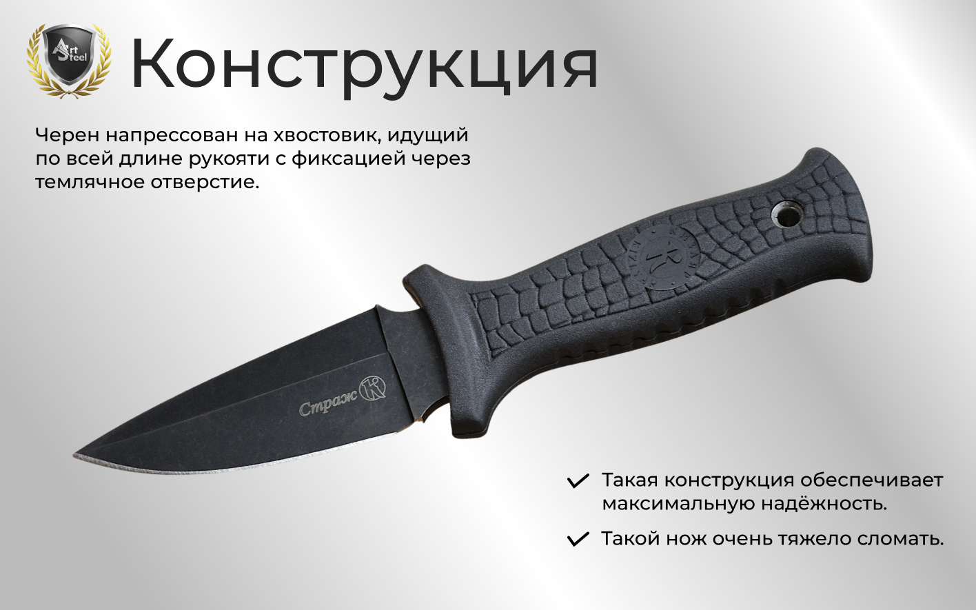 Эластроновая рукоять обеспечивает надежное и безопасное удержание ножа в руке даже при интенсивном использовании или в сложных условиях. Она легко очищается от грязи, пыли или остатков пищи, не впитывает запахи и не требует особого ухода, что делает обслуживание ножа простым и удобным. Рукоять из эластрона будет служить долгое время, обеспечивая надежную поддержку и прочность. Конструкция ножа сплошная, хвостовик проходит по всей длине рукояти. Из особенностей ножа можно отметить начилие отверстия под темляк на рукояти.