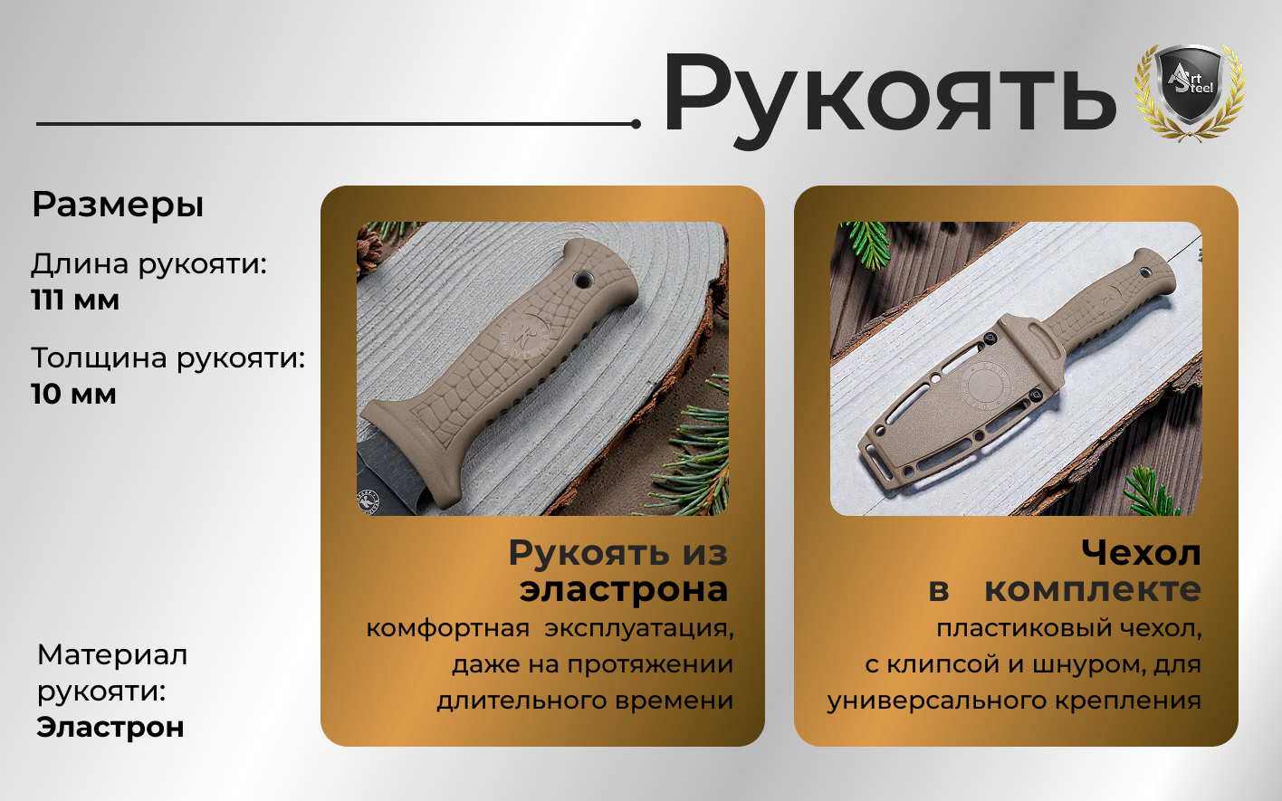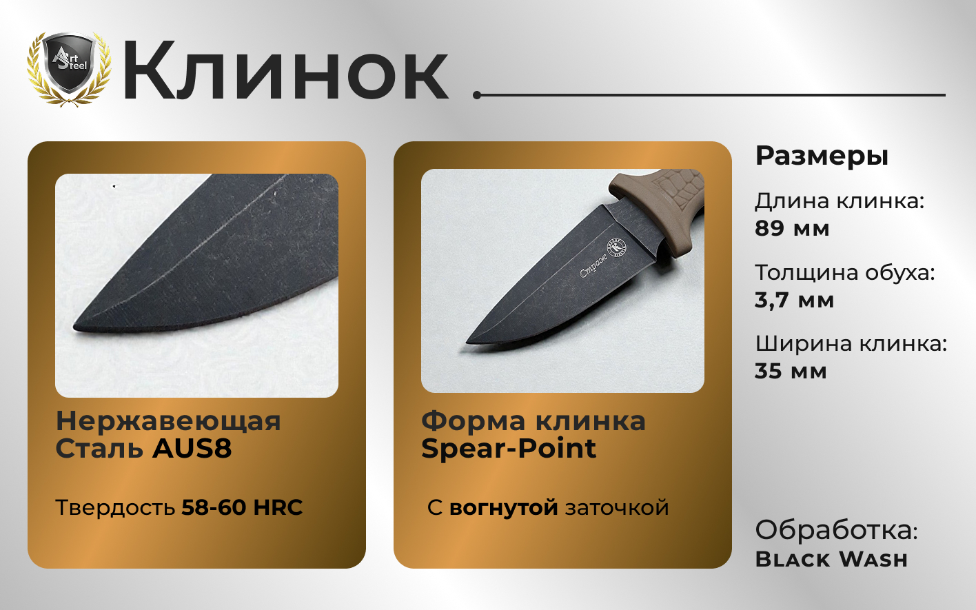 Клинок из стали AUS8 с твердостью 58-60 HRC представляет собой отличный выбор для ножей, используемых в кемпинге, туризме, рыбалке и других видах активного отдыха на природе. Данная сталь обладает высокой корозионной стойкостью, оптимальной твердостью и долго сохраняет заточку. Клинок профиля Spear point выглядит как кинжал, имеет симметричную форму с острым кончиком, что обеспечивает удобство использования как для правшей, так и для левшей. Это делает его универсальным при эксплуатации. Вогнутые спуски часто встречаются на разделочных и охотничьих ножах. Клинок с вогнутыми спусками имеет тонкий острый край, обеспечивающий отличную режущую способность. Обработка Blackwash помогает скрыть царапины и следы использования на клинке. Темный оттенок помогает замаскировать повреждения, сохраняя клинок в хорошем состоянии на протяжении долгого времени.