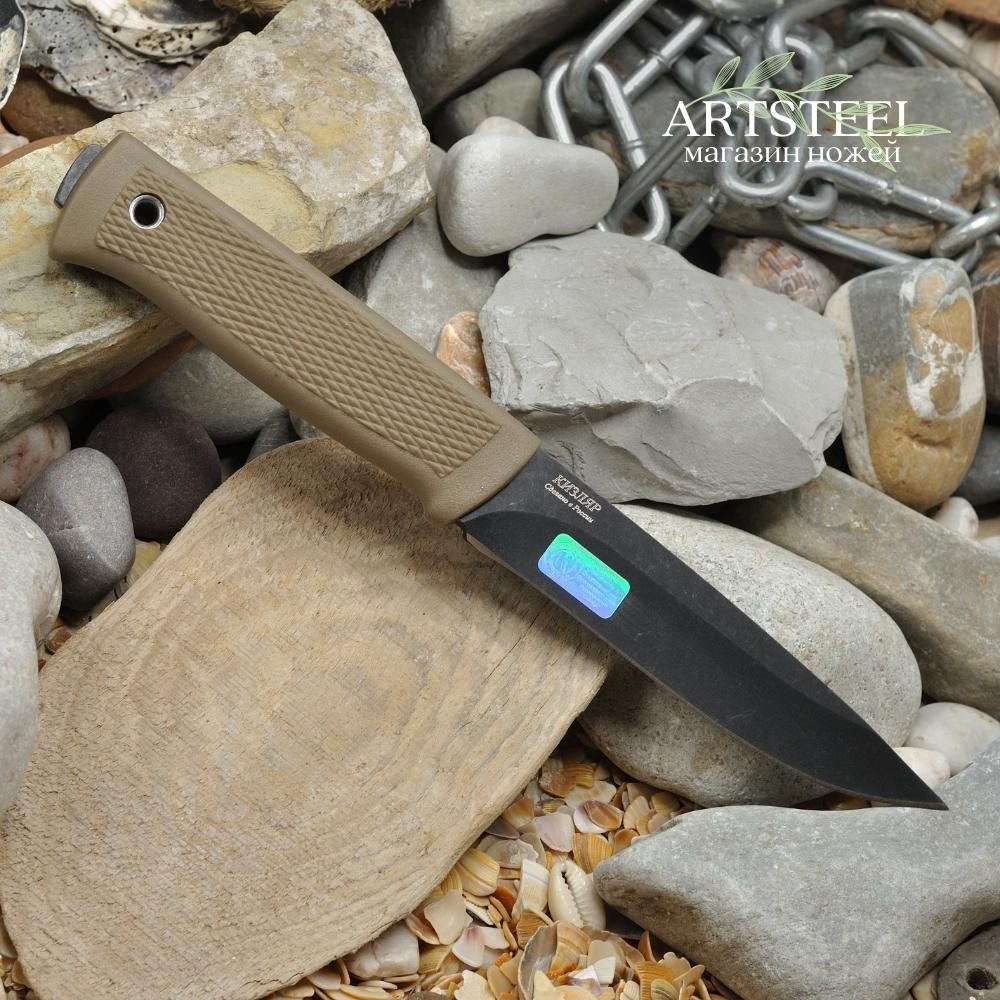 Эластроновая рукоять обеспечивает надежное и безопасное удержание ножа в руке даже при интенсивном использовании или в сложных условиях. Она легко очищается от грязи, пыли или остатков пищи, не впитывает запахи и не требует особого ухода, что делает обслуживание ножа простым и удобным. Рукоять из эластрона будет служить долгое время, обеспечивая надежную поддержку и прочность. Конструкция ножа: черен напрессован на хвостовик, идущий по всей длине рукояти с фиксацией через темлячное отверстие. Из особенностей ножа можно отметить начилие отверстия под темляк на рукояти.