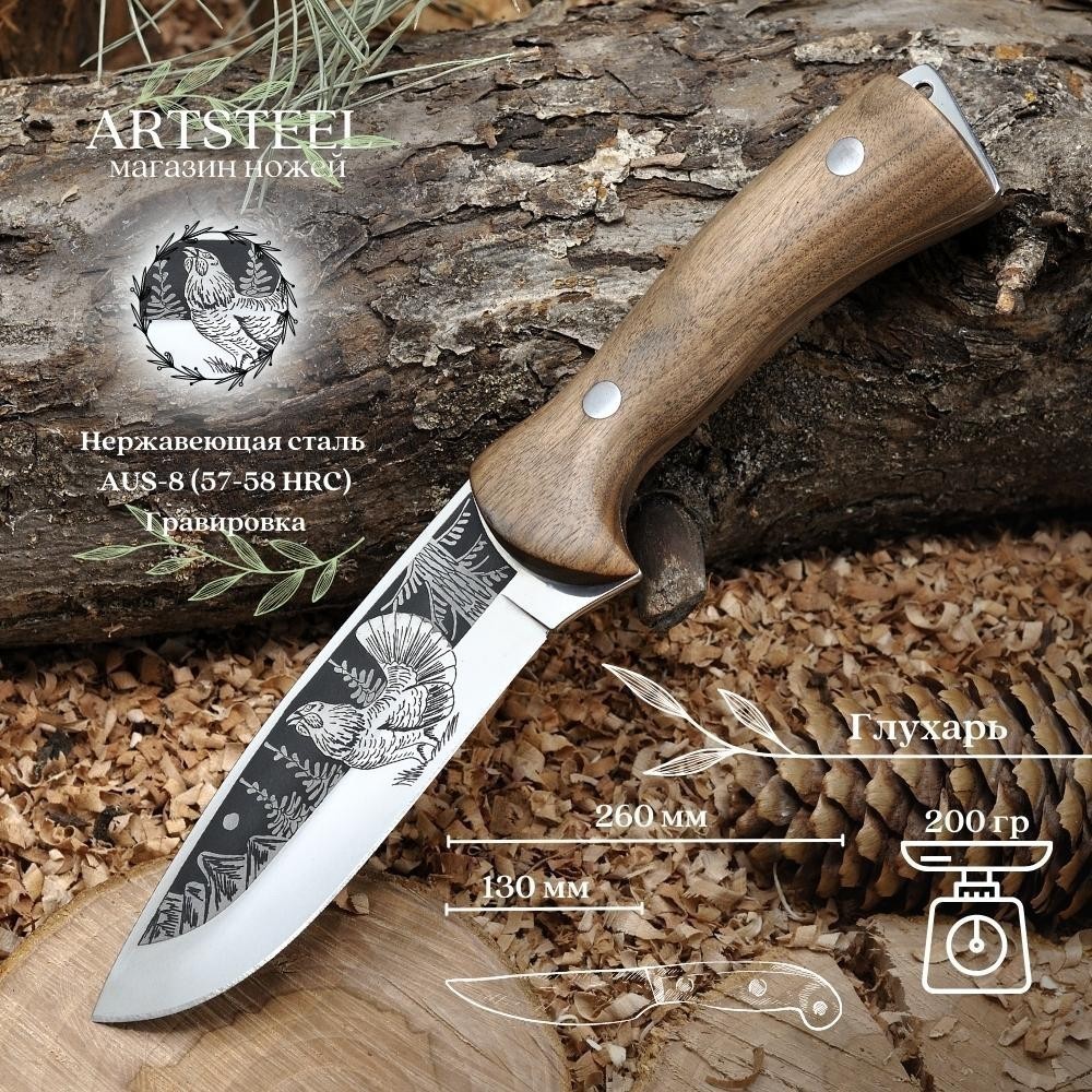 Ореховое дерево, из которого выполнена рукоять туристического ножа Глухарь, имеет привлекательный внешний вид со своей уникальной текстурой и узорами. Конструкция: половины рукояток с помощью штифтов скреплены с клинком.