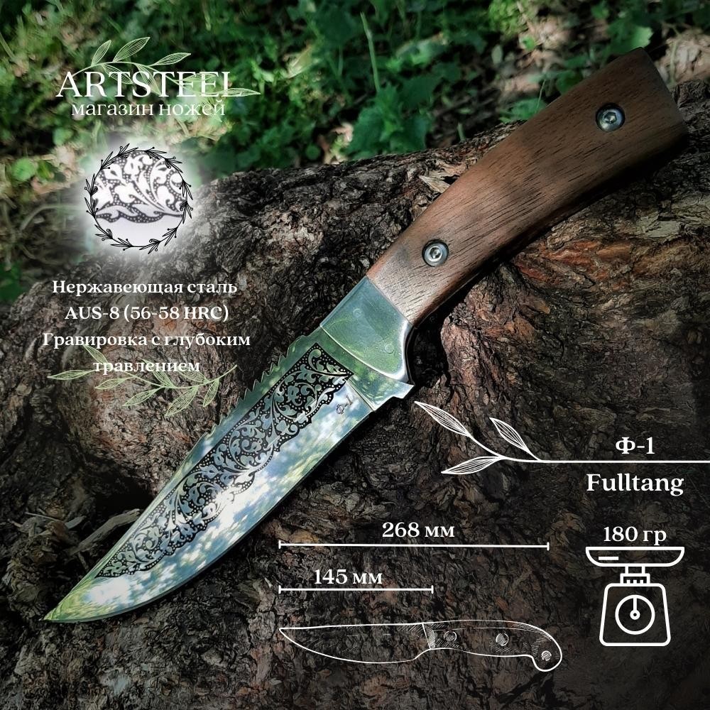 Рукоять ножа Ф-1 выполнена из благородного орехового дерева, которое является популярным и прочным материалом для изготовления рукоятей. Его текстура отличается глубокими и насыщенными оттенками, создает привлекательный внешний вид. Дерево является естественным изолятором, помогающим предотвратить передачу тепла или холода от клинка к руке пользователя, что гарантирует комфортную эксплуатацию ножа в холодных или жарких условиях. Конструкция ножа: сплошная, винтовой монтаж рукояти.