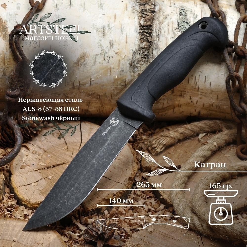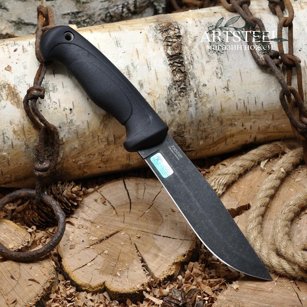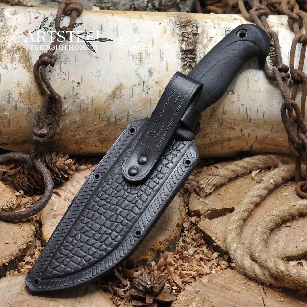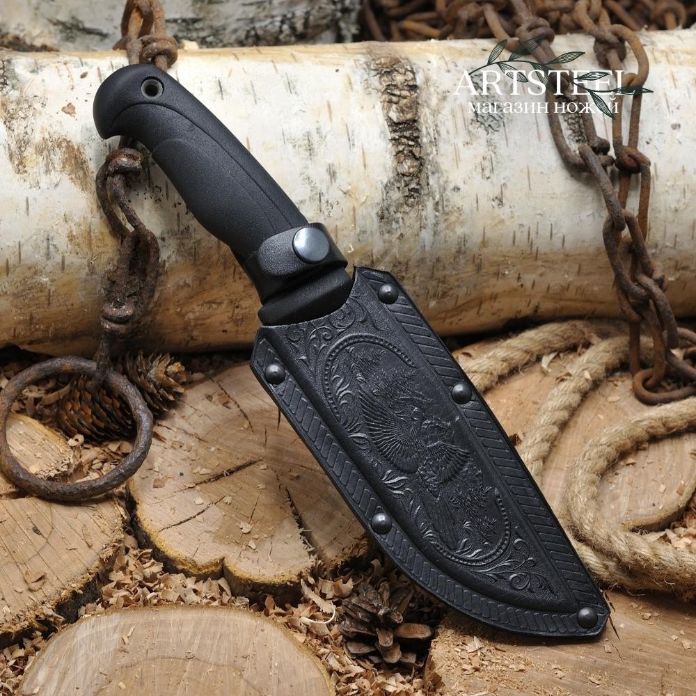 Эластроновая рукоять обеспечивает надежное и безопасное удержание ножа в руке даже при интенсивном использовании или в сложных условиях. Она легко очищается от грязи, пыли или остатков пищи, не впитывает запахи и не требует особого ухода, что делает обслуживание ножа простым и удобным. Рукоять из эластрона будет служить долгое время, обеспечивая надежную поддержку и прочность. Конструкция ножа: половины рукояток с помощью штифтов скреплены с клинком. Из особенностей ножа можно отметить начилие отверстия под темляк на рукояти.