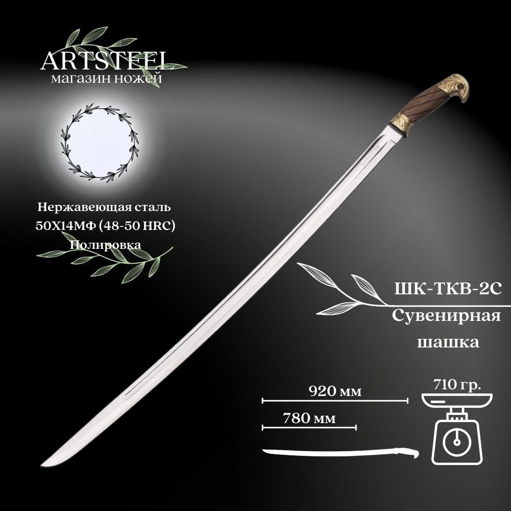 Клинок Шашки ШК-ТКВ-2С выполнен из нержавеющей стали 50Х14МФ, не имеет заточки. Форма клинка - curved blade (изогнутый клинок). Полированный клинок выглядит очень элегантно и привлекательно: гладкая и блестящая поверхность придает шашке роскошный вид. Ореховое дерево, из которого выполнена рукоять, имеет привлекательный внешний вид со своей уникальной текстурой и узорами.