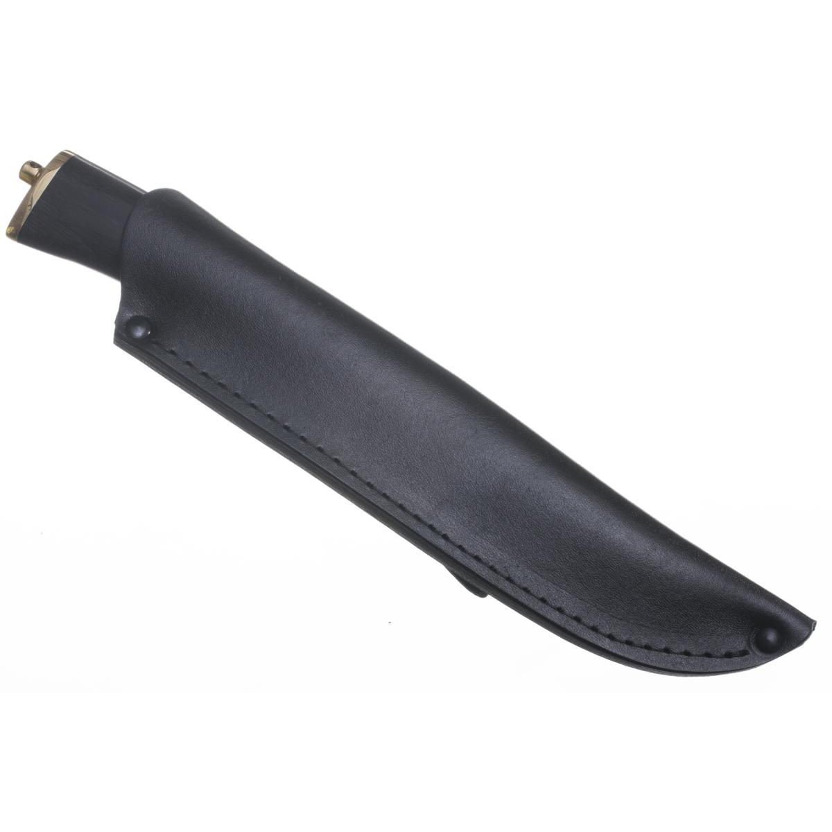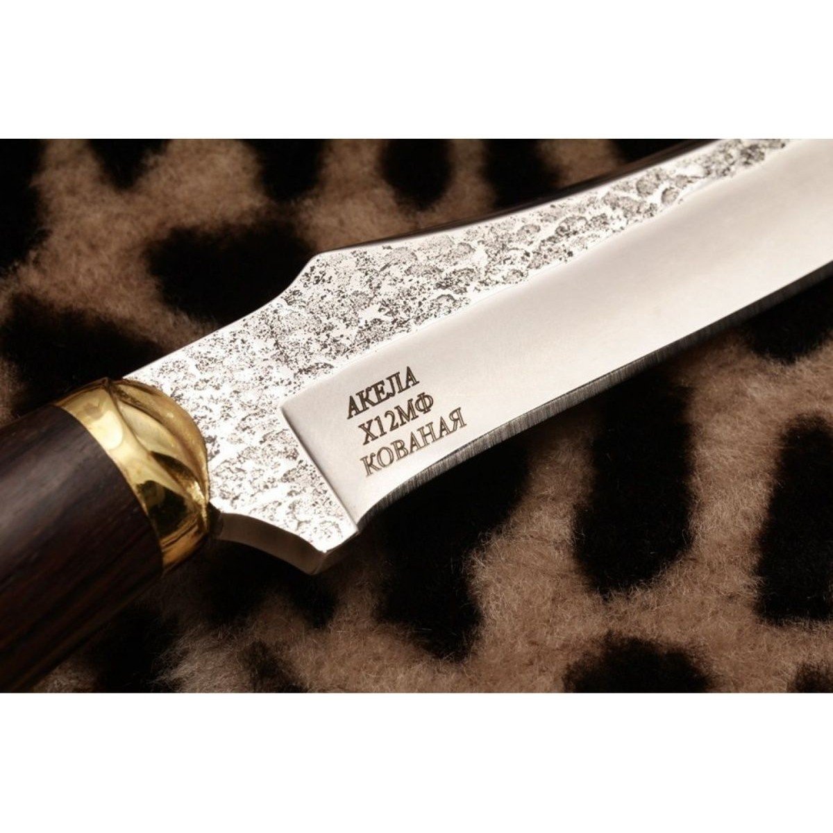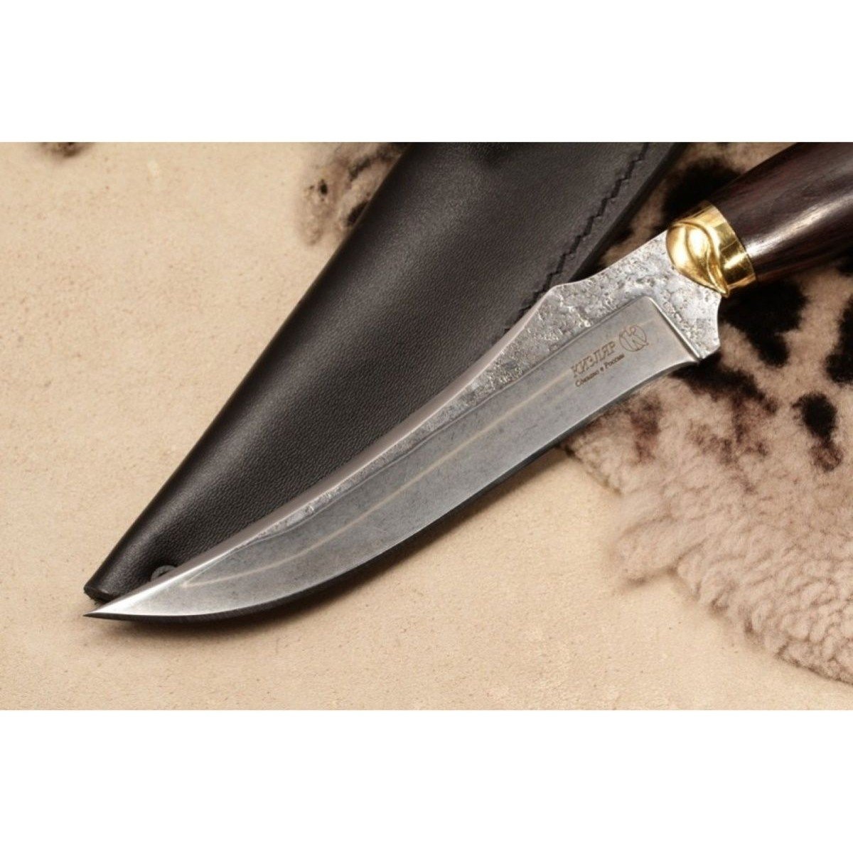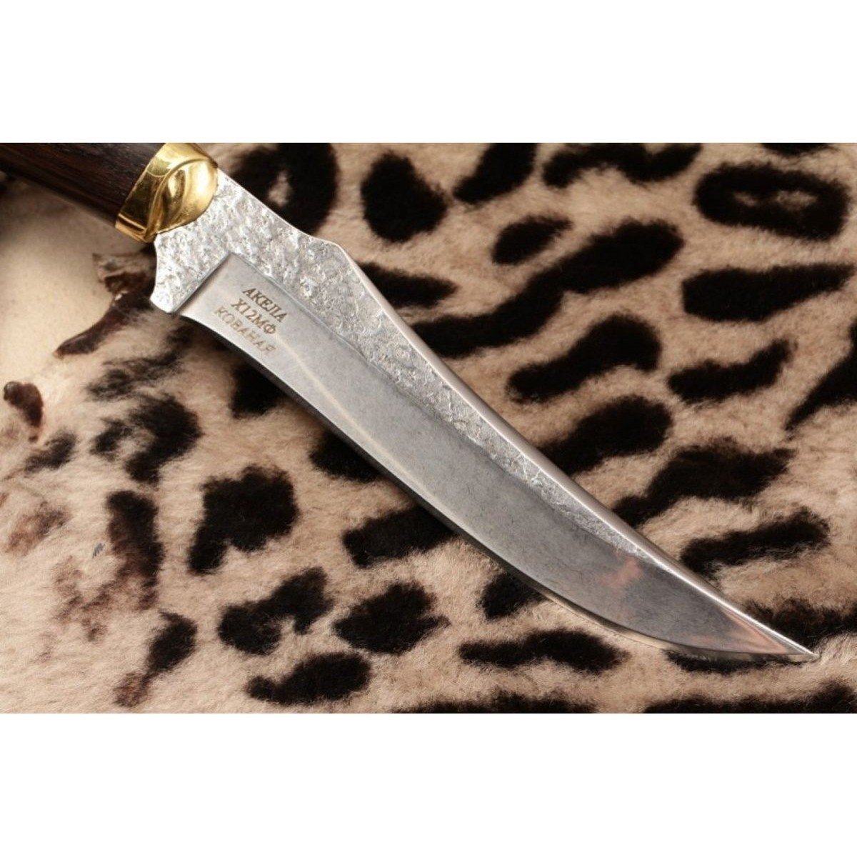 Сталь Х12МФ твёрдость 58-60 HRC, российская инструментальная кованная сталь прекрасно подходит любителям ножей с агрессивным резом, держит остроту очень продолжительное время. Легко правится на алмазных брусках и ремнях с нанесением абразива. Средняя стойкость к коррозии, необходим минимальный уход за сталью. При неправильном использовании ножа возможны сколы на режущей кромке, невысокая ударная прочность.