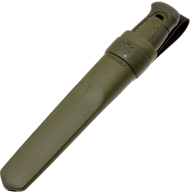 Рукоятка ножа изготавливается из прочного пластика. Этот материал является одним из наиболее выносливых, так как не поддается коррозии под воздействием воды, не обесцвечивается на солнце, сохраняет свойства в большом диапазоне температур. Размер рукоятки достаточно большой, чтобы Morakniv Kansbol было удобно держать в руках во время работ под нагрузкой. Поверхность сделана не скользкой, а к тому же, она не ровная, что также препятствует проскальзыванию рукоятки в ладони. Цвет ручки ножа - темно-зеленый, как и ножен.
