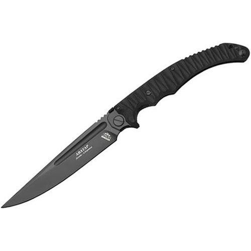 Рукоять эргономически выгодной формы с накладками из пластика G-10 и рифлением типа «токсик» гарантирует цепкое удержание ножа в мокрой или скользкой руке и впечатляющее удобство самых разнообразных хватов. Прочный замок типа «лайнер-лок» с толщиной запирающей пластины в 2 мм надежно запирает клинок. Открывается который одной рукой – за оригинальную «таблетку», размещенную на обухе. А элегантный черный клинок длиной 148 мм из инструментальной стали D2, снабженный изящным фальшлезвием и коническим долом, обладает превосходными проникающими и режущими свойствами.
