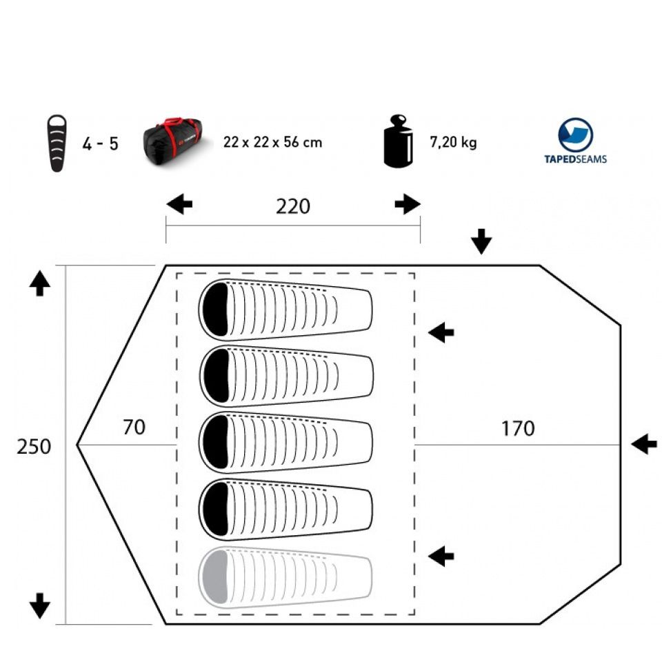 размеры – (170+220+70) см * 250 см *170 см (в сложенном виде – 22 см*22 см*56 см)