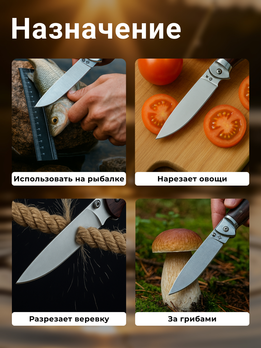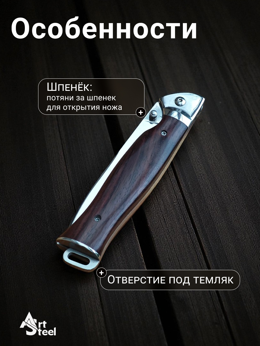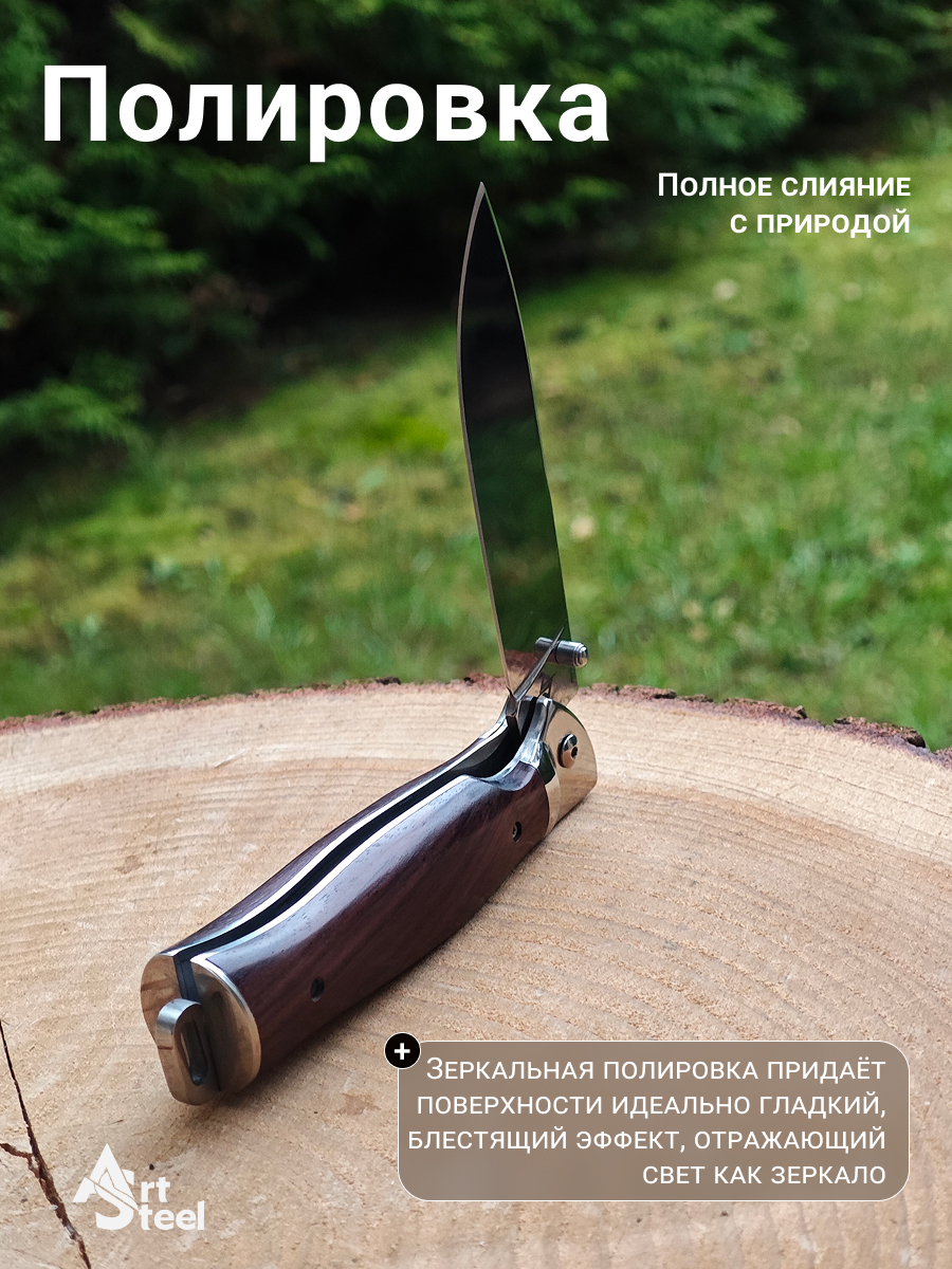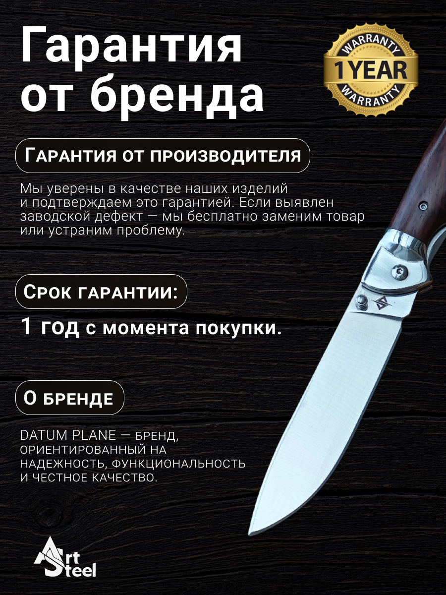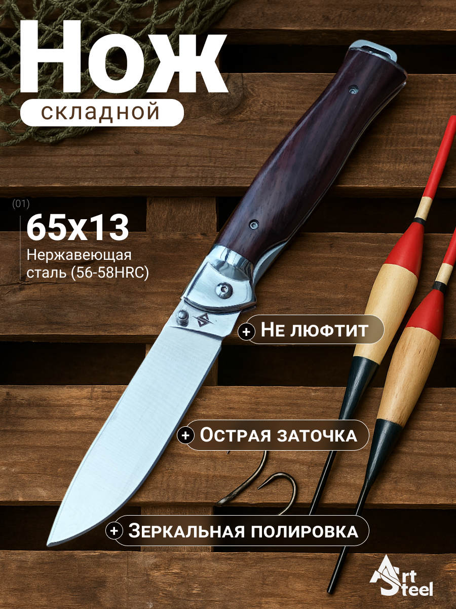 Клинок изготовлен из нержавеющей стали 65Х13, которая отличается высокой твердостью, износостойкостью и длительным удержанием остроты. Сталь легко затачивается и обрабатывается. Форма Drop-Point универсальна и подходит для резки, разделки и других задач на природе.Рукоять из дерева имеет естественную текстуру и уникальные узоры, что придает ножу неповторимый внешний вид. Она удобна при длительном использовании и не ощущается холодной или горячей при контакте с рукой.