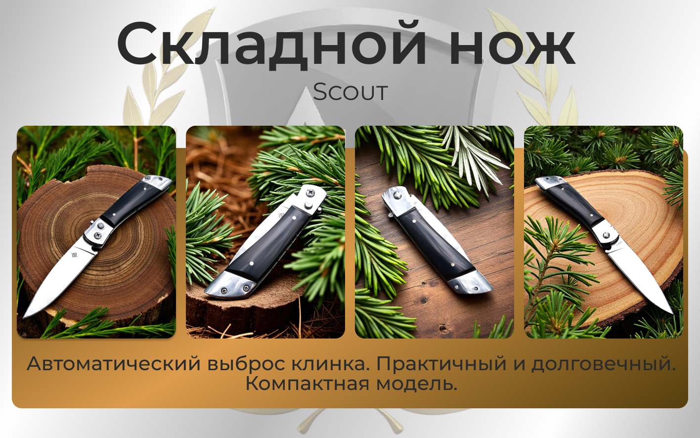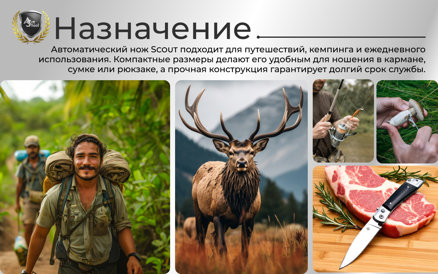 Рукоять выполнена из металла и смолы, что обеспечивает удобный хват и прочность конструкции. Складной механизм снабжен надежным замком Button Lock (кнопочный замок). Он прост и безопасен в использовании: клинок открывается и фиксируется одним нажатием, а для складывания достаточно снова нажать кнопку.Автоматический складной нож Scout станет отличным выбором для охоты, рыбалки, туризма или в качестве подарка мужчине. Этот нож сочетает практичность, удобство и современный дизайн, оставаясь универсальным инструментом для активного отдыха.