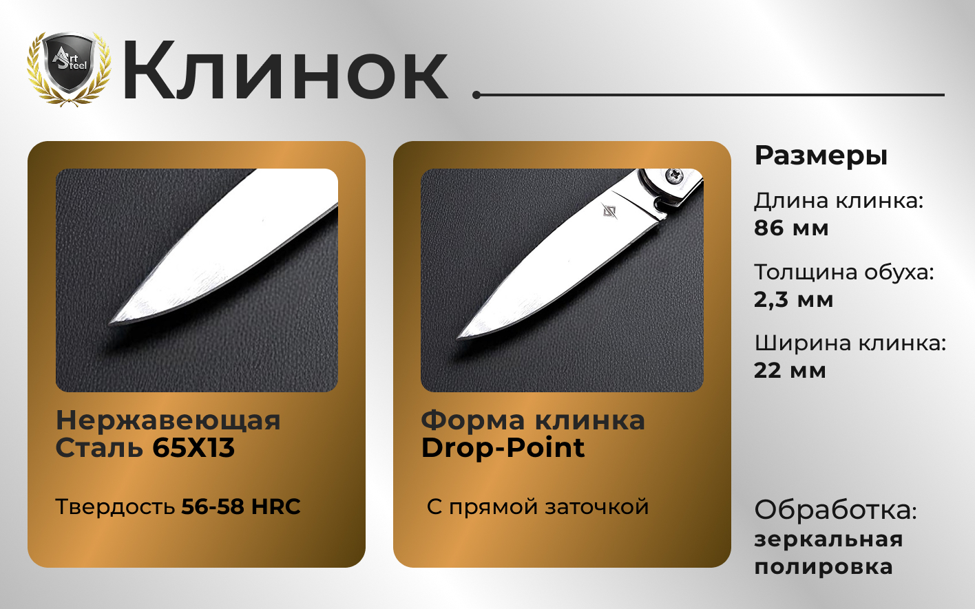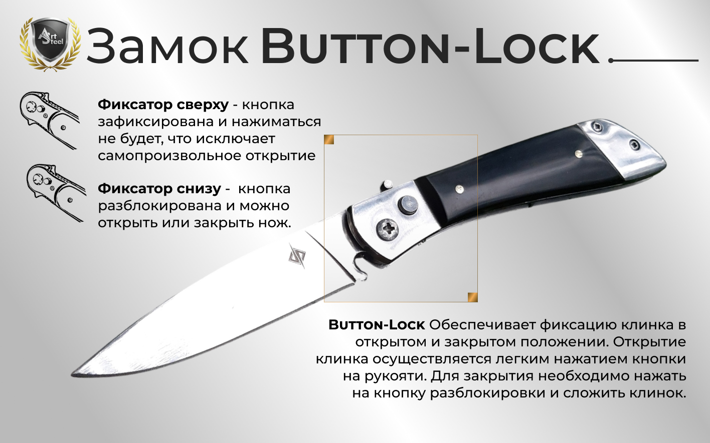 Лезвие изготовлено из стали 65Х13 – популярного сплава с высоким содержанием хрома. Такая сталь не ржавеет, обладает хорошей твердостью и износостойкостью, долго держит заточку и при этом легко правится даже в походных условиях. Универсальная форма клинка Drop-point делает нож практичным для резки, разделки и других повседневных задач.Рукоять и замок Button Lock