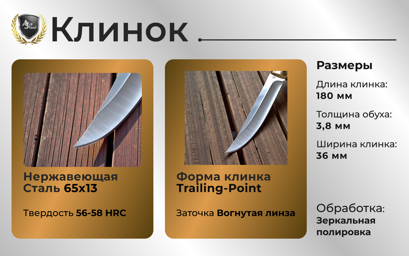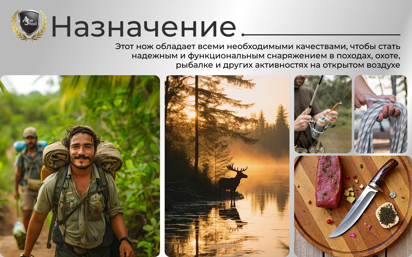 Изготовленный из стали 65Х13 (56-58 HRC) клинок ножа фиксированного в форме Trailing-Point позволяет быстро разделывать дичь и выполнять другие задачи на природе.