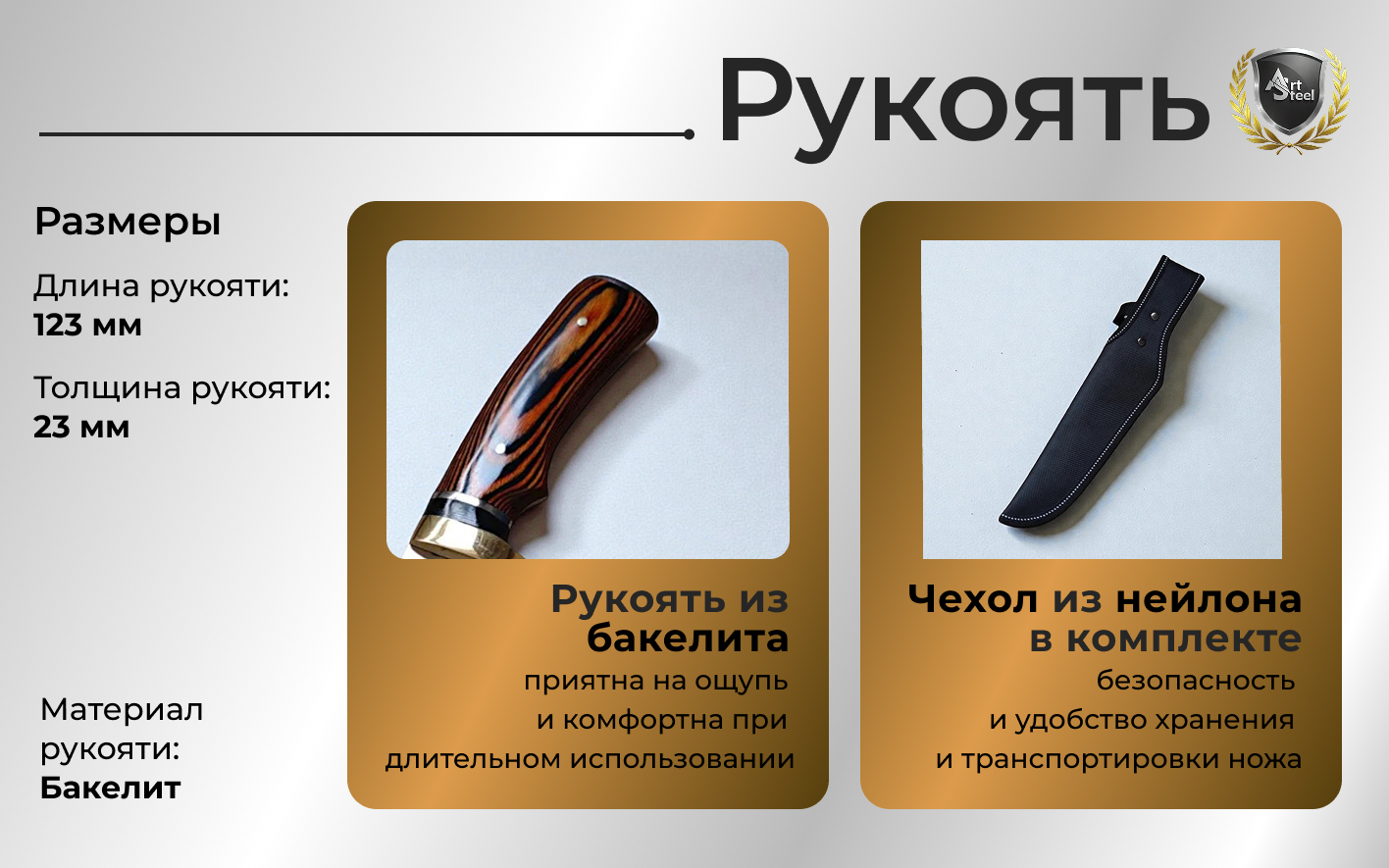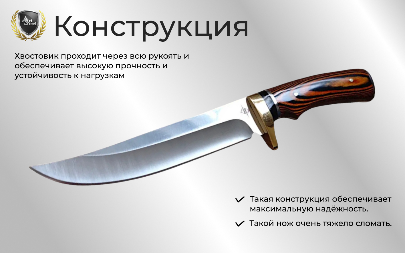 Рукоять из металла и бакелита у охотничьего ножа обеспечивает устойчивый хват, а конструкция с замком-фиксатором (Button Lock) и технологией full-tang повышает прочность и безопасность использования.