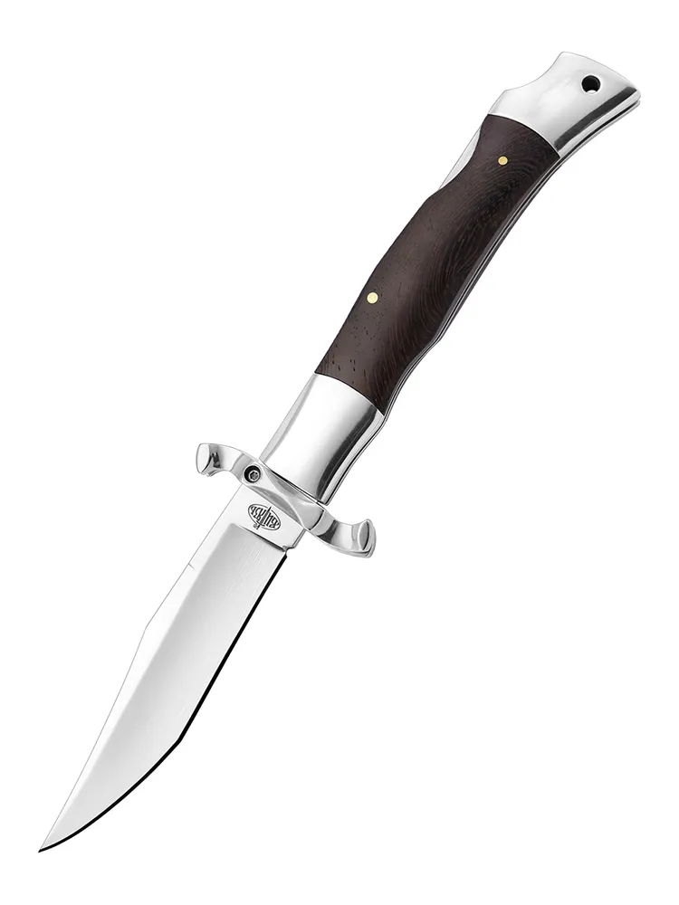 Рукоять с накладками из дерева венге различной прочности и красивой текстуры. Она удобно ложится в ладонь, имеет развитую складную гарду для пальцев и придаёт ножу выразительный вид.