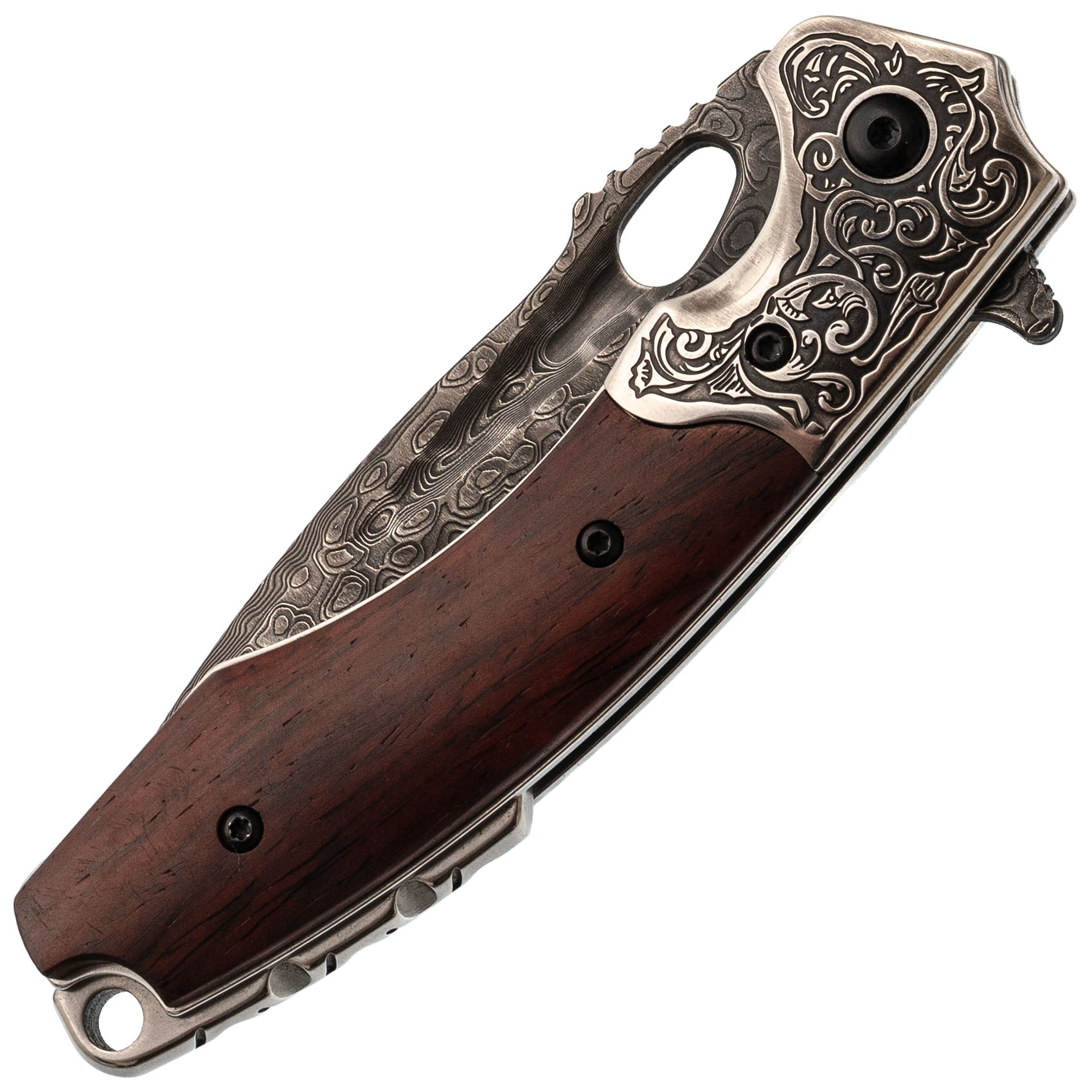 Рукоять из дерева отличается прочностью, приятной текстурой и влагостойкостью благодаря специальной пропитке. Она надёжно лежит в руке, а стальной больстер и изящная форма добавляют ножу элегантности. Замок Liner Lock фиксирует клинок в открытом положении, обеспечивая безопасность при использовании.