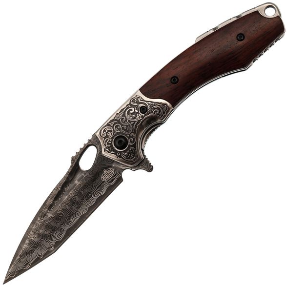Клинок выполнен из многослойной дамасской стали, известной своей прочностью, высокими режущими свойствами и характерным узором, который ценят коллекционеры и любители ножей. Геометрия клинка с изогнутой линией обуха и удобным выступом для открытия обеспечивает как чистый рез, так и точный контроль при работе. Подпальцевый упор повышает безопасность и удобство хвата.