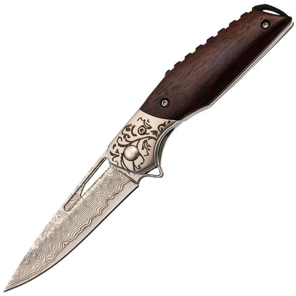 Клинок выполнен из многослойной дамасской стали, известной своей прочностью, высокими режущими свойствами и характерным узором, который ценят коллекционеры и любители ножей. Геометрия клинка с изогнутой линией обуха и удобным выступом для открытия обеспечивает как чистый рез, так и точный контроль при работе. Подпальцевый упор повышает безопасность и удобство хвата.