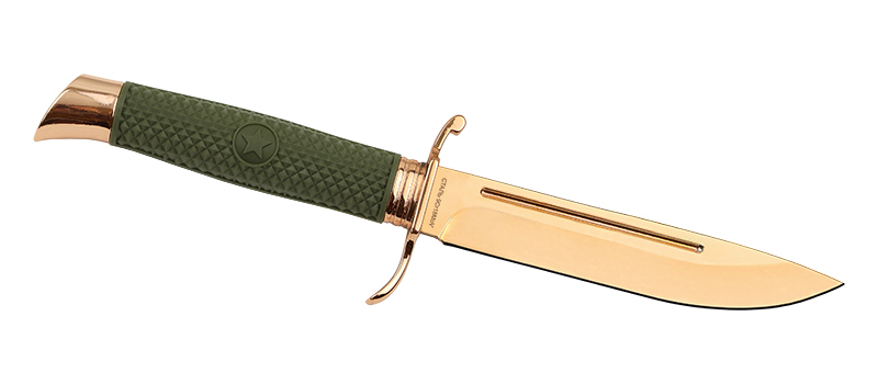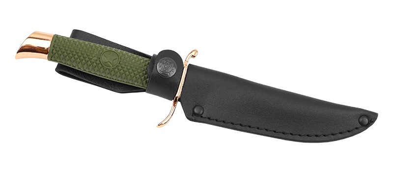 Рукоять со сквозным монтажом выполнена из эластомера — прочного и влагостойкого материала, который обеспечивает комфортный и надёжный хват даже в сложных погодных условиях. Фигурная гарда защищает пальцы при активной работе, а массивное стальное навершие придаёт конструкции завершённый вид.