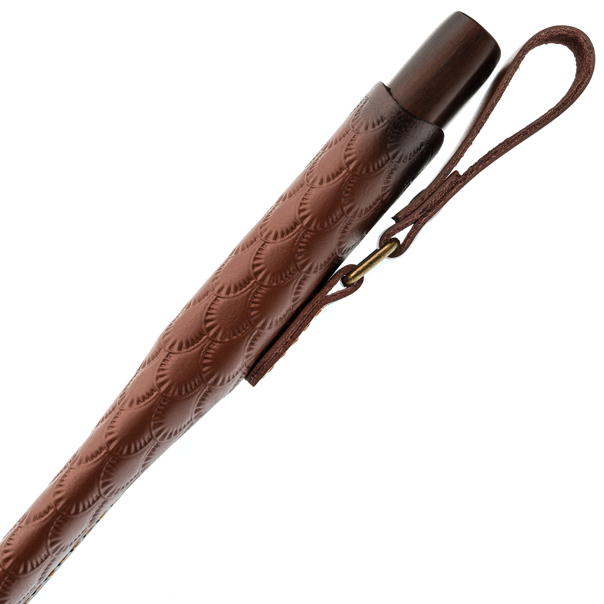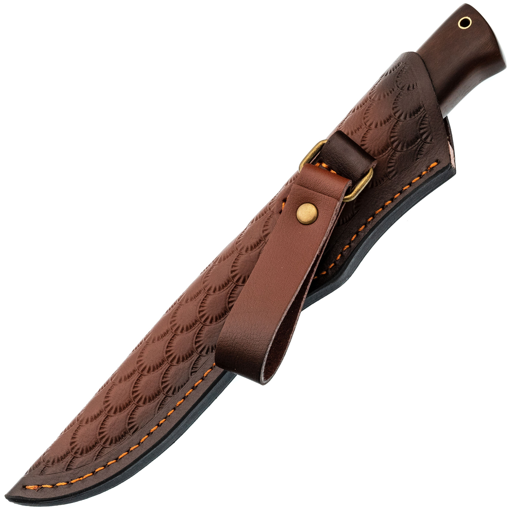 Рукоять из натурального дерева удобно ложится в ладонь, обладает приятной текстурой и эстетикой. Её форма обеспечивает надёжный хват, а сочетание древесины с узорчатым клинком подчёркивает классический характер ножа.