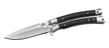 Традиционный нож-бабочка сочетает в себе стиль, надежность и функциональность. Клинок типа drop-point выполнен из легированной стали 9Cr18MoV, закалённой до твердости 57–59 HRC. Такая сталь хорошо держит заточку, устойчива к износу и ремонту, а сатинированная поверхность придает клинку аккуратный и современный вид.