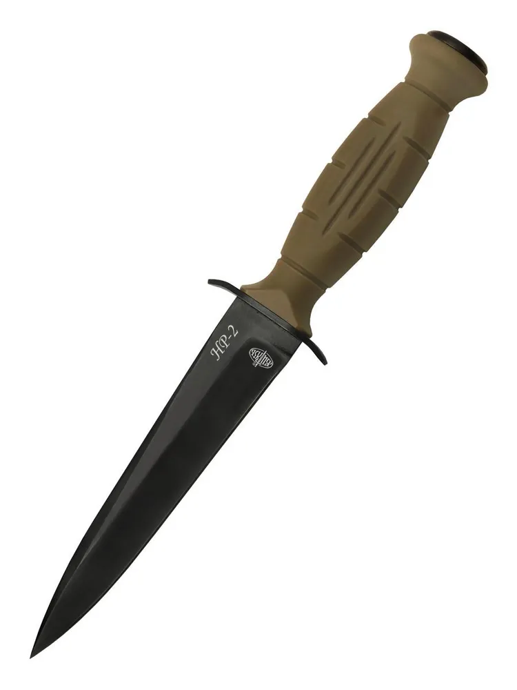 НР-2 относится к популярной серии финок, но выделяется среди них своей нетрадиционной формой. Симметричная пластиковая рукоять плавно переходит в кинжаловидный клинок, что придаёт ножу хищный и узнаваемый силуэт. При этом он остаётся практичным в быту: клинок из углеродистой стали У8 отличается высокой прочностью, отлично режет и сохраняет заточку.