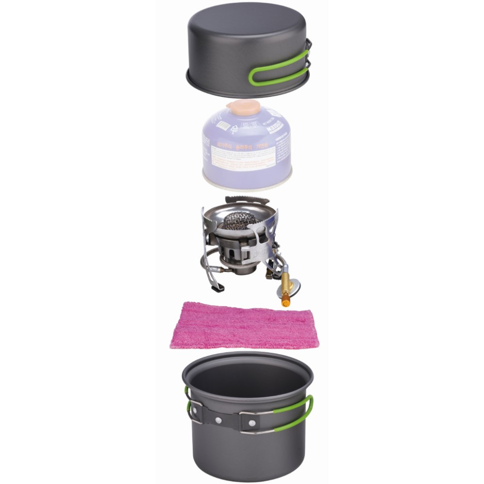 Комплектация: горелка, котелок, кастрюля, салфетка, чехол, инструкция по применению, гарантийный лист.