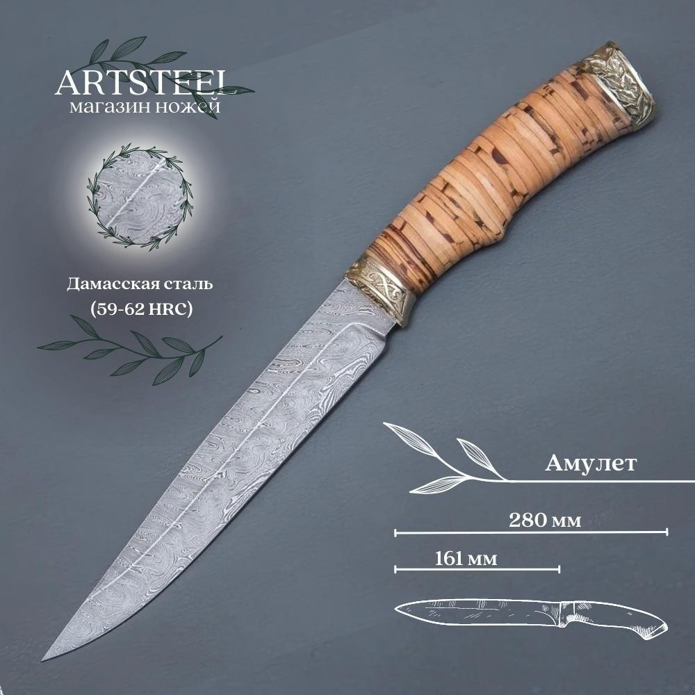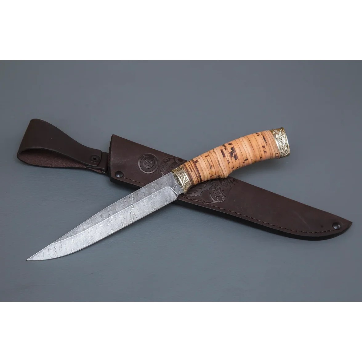 Нож Анчар из дамасской стали, рукоять береста, литьё мельхиор CH003