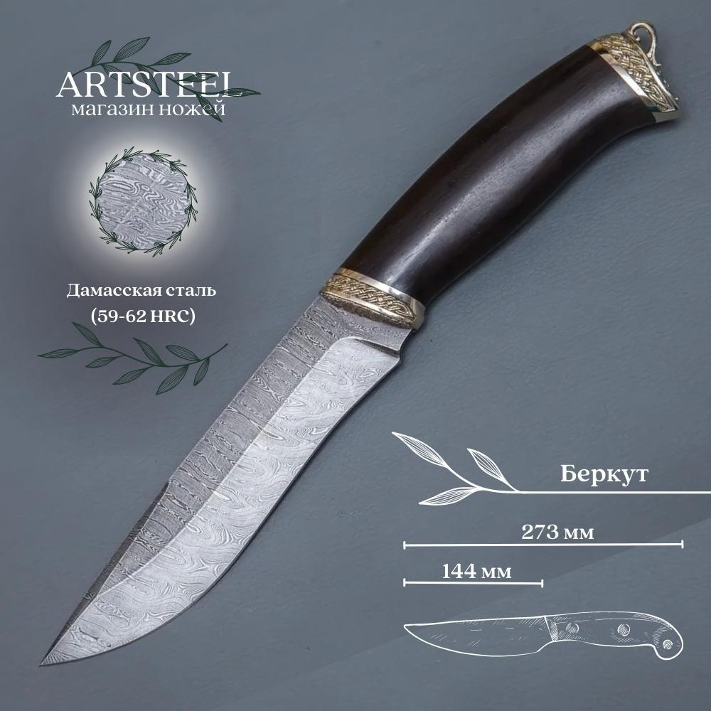 Нож Беркут из дамасской стали, рукоять черное дерево, литьё мельхиор CH006-3