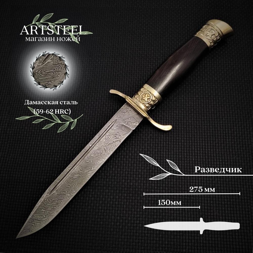 Нож Разведчик из дамасской стали, рукоять черное дерево, литьё мельхиор CH049-1