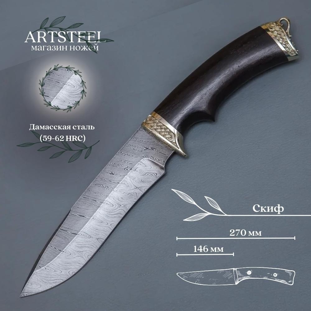 Нож Скиф из дамасской стали, рукоять черное дерево, литьё мельхиор CH051-1