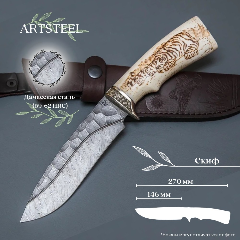 Нож Скиф из дамасской стали, рукоять из кости, литье мельхиор CH051-14
