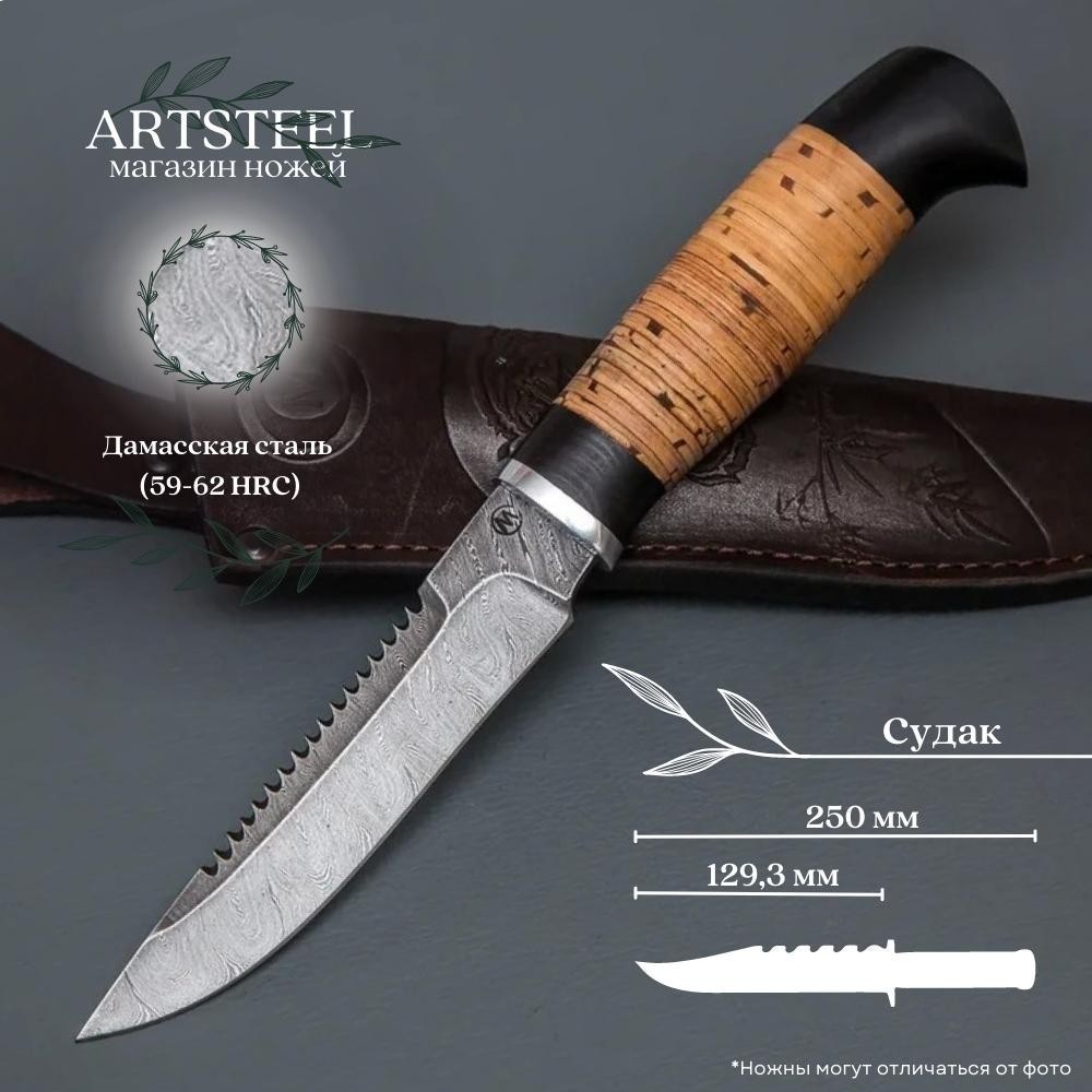 Нож Судак из дамасской стали, рукоять береста, граб, литье дюраль CH057