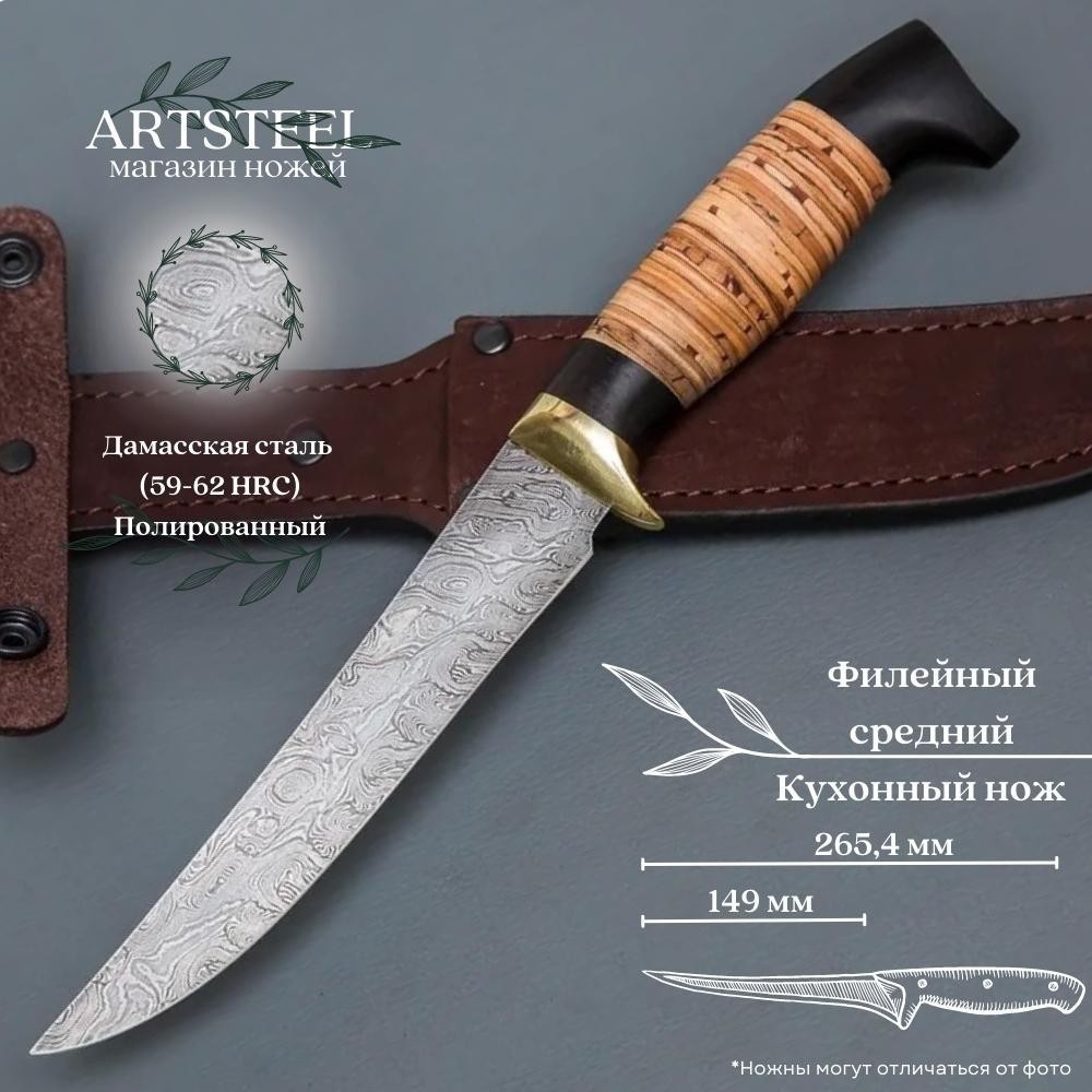 Нож Филейный средний из дамасской стали, рукоять береста, граб, литьё мельхиор CH069