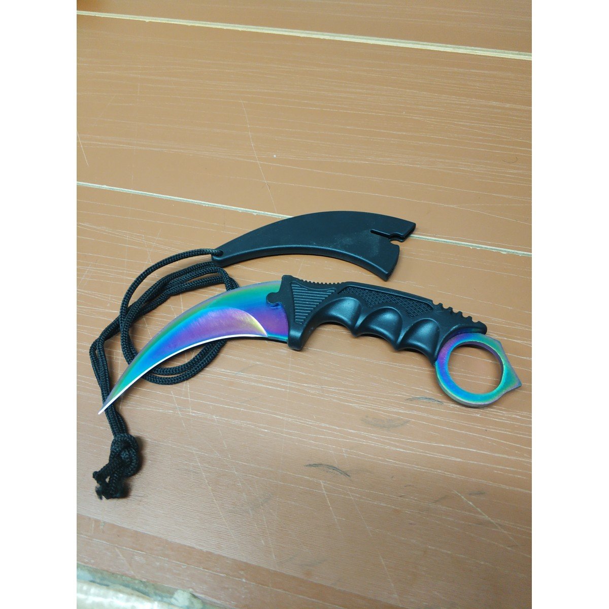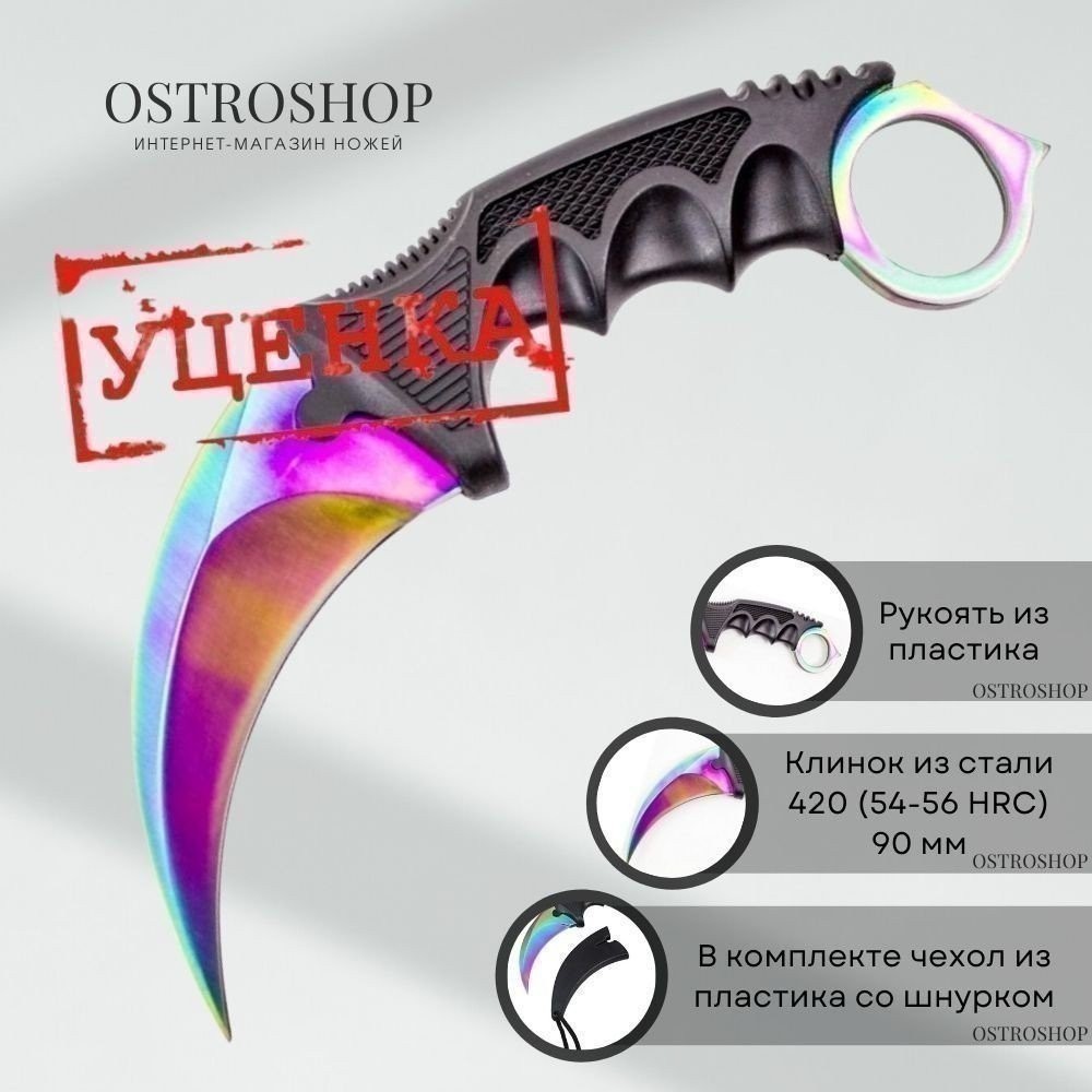 Удобный, надежный керамбит. Клинок с титановым покрытием имеет типичную форму хищного когтя, словно позаимствованную у кошки. Он выполнен из прочной нержавеющей стали, которая отличается хорошей износостойкостью и эффективно сопротивляется коррозии. Рукоять пластиковая, с выраженными подпальцевыми выемками и упором для большого пальца. Рукоять заканчивается кольцом с небольшим выступом-стеклобоем. Керамбит спроектирован так, что одинаково удобен и для прямого хвата, и для обратного. В комплект входят прочные и надежные пластиковые ножны со шнурком.