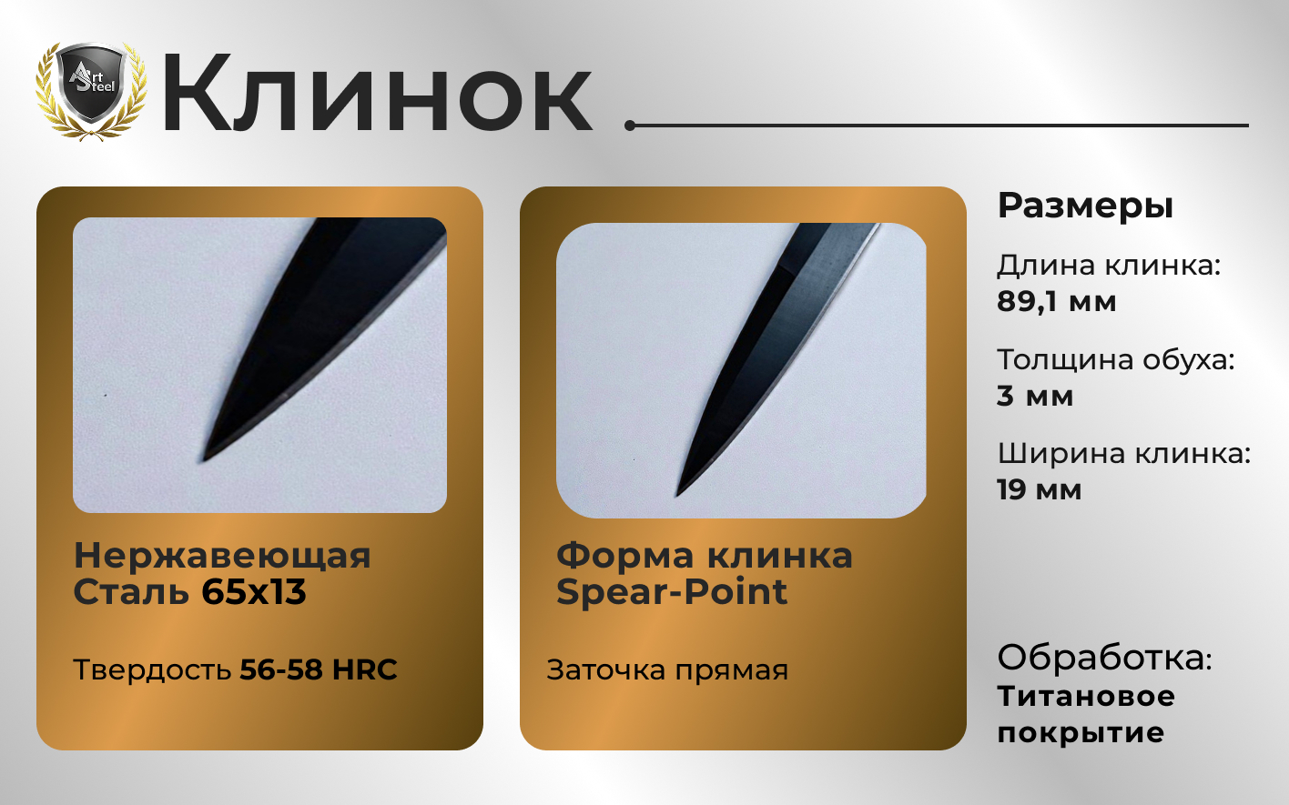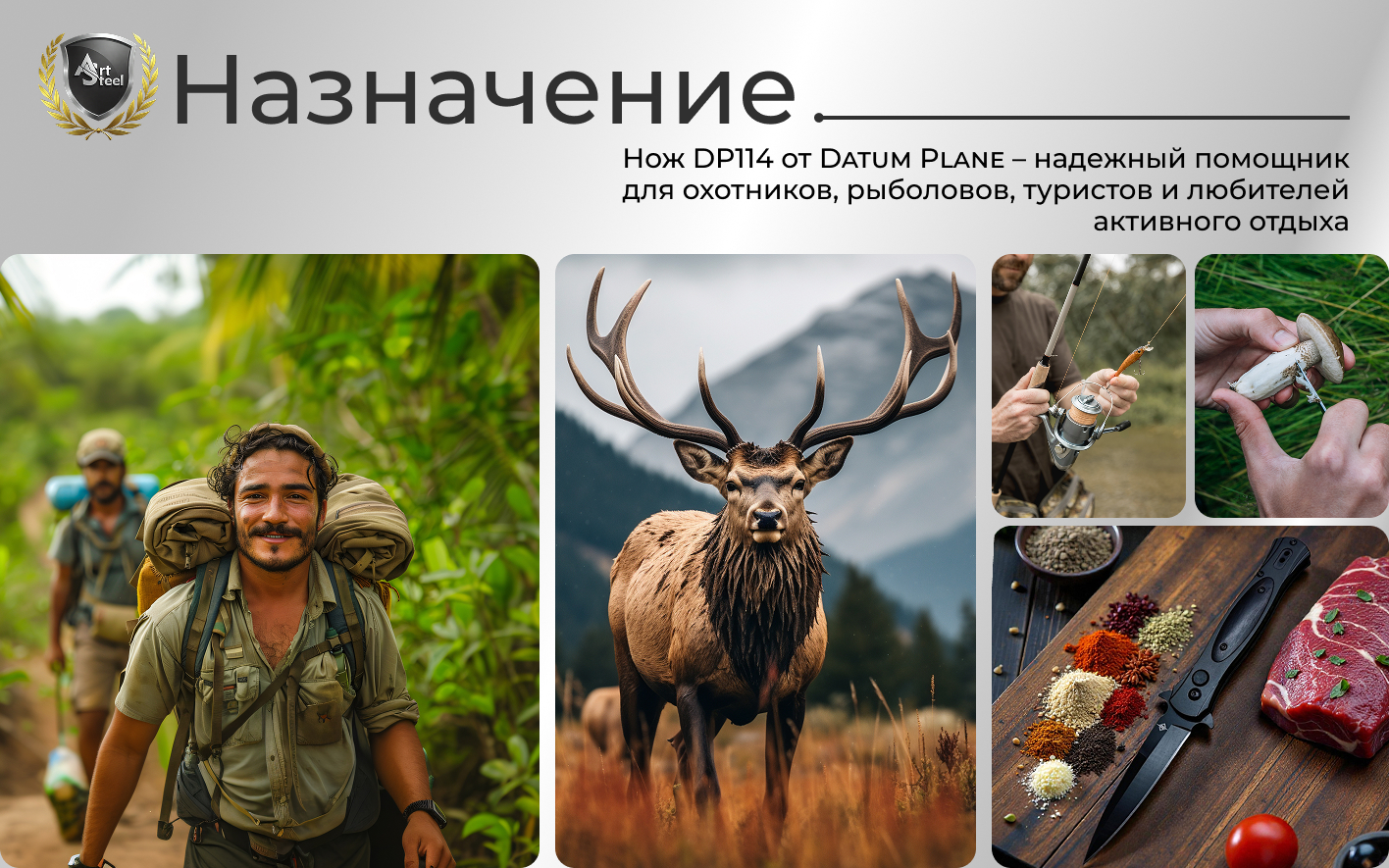 Нож DP114 выполнен из нержавеющей стали 65х13. Лезвие из данной стали обладает высоким уровнем твердости и износостойкости, неприхотливо в заточке, а режущая кромка остаётся острой на протяжении долгого времени.