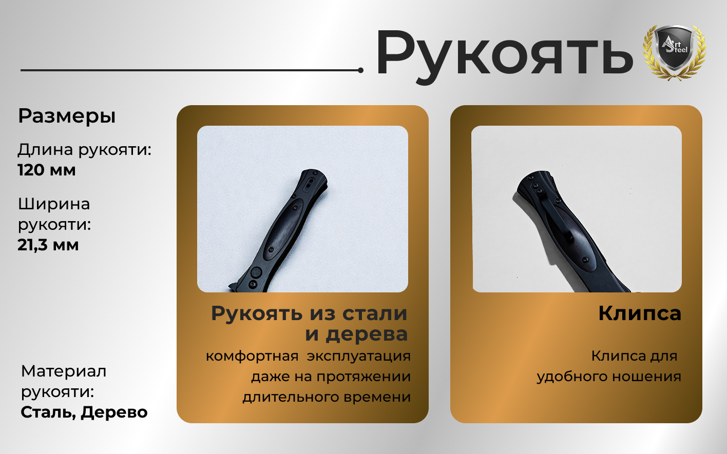 Удобная эргономичная рукоять выполнена из стали, имеет деревянную вставку. Для крепления к карману или ремню на рукояти предусмотрена клипса.