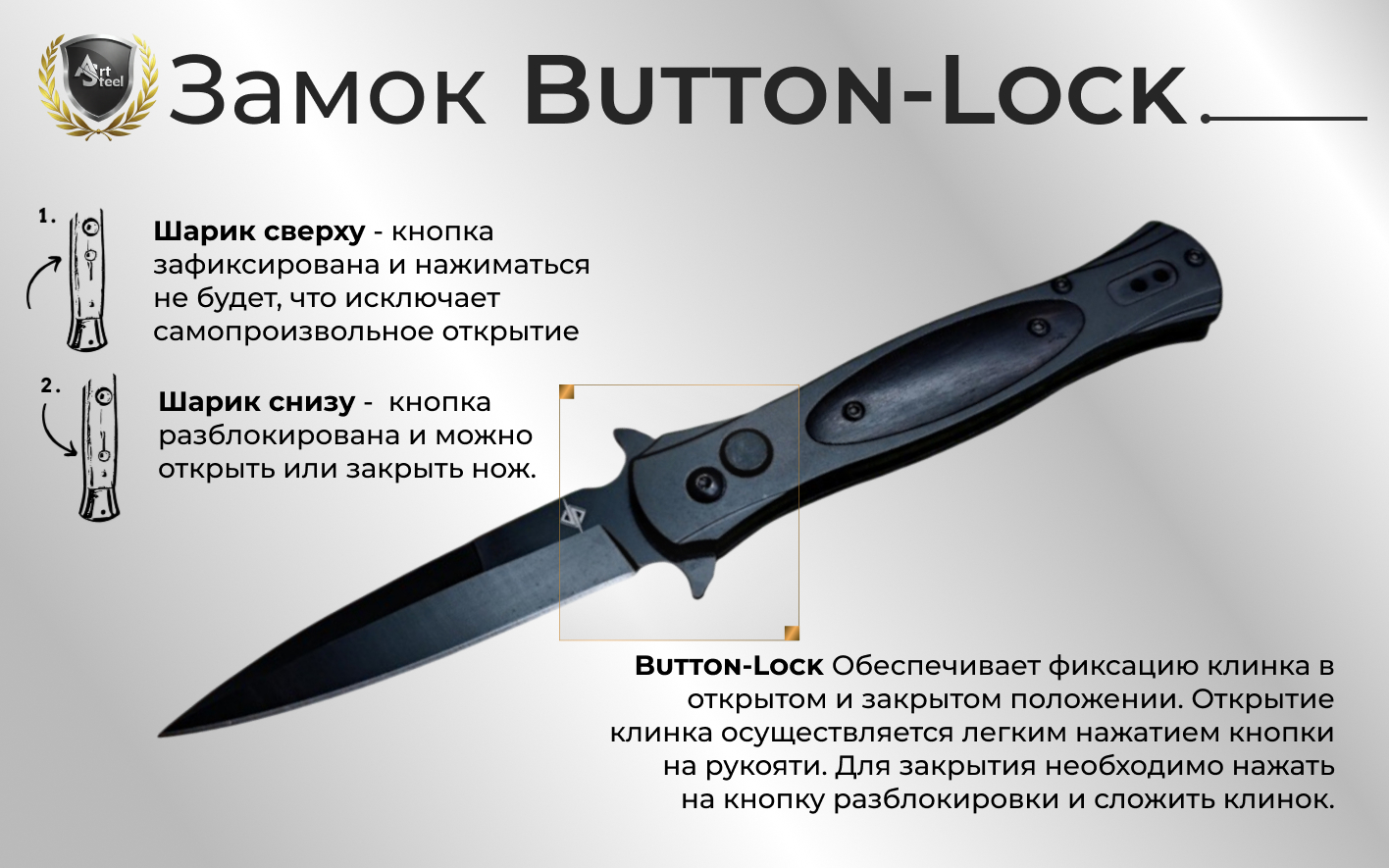Складной нож оснащён замком button lock. Чтобы раскрыть нож необходимо нажать на кнопку, расположенную на рукояти. Нож откроется и клинок зафиксируется. Чтобы сложить лезвие обратно, необходимо нажать на кнопку и убрать лезвие. Такой замок прост в использовании и достаточно надёжен: кнопка расположена в удобном месте и может быть легко нажата одним пальцем, что делает процесс открытия и закрытия ножа комфортным и быстрым.