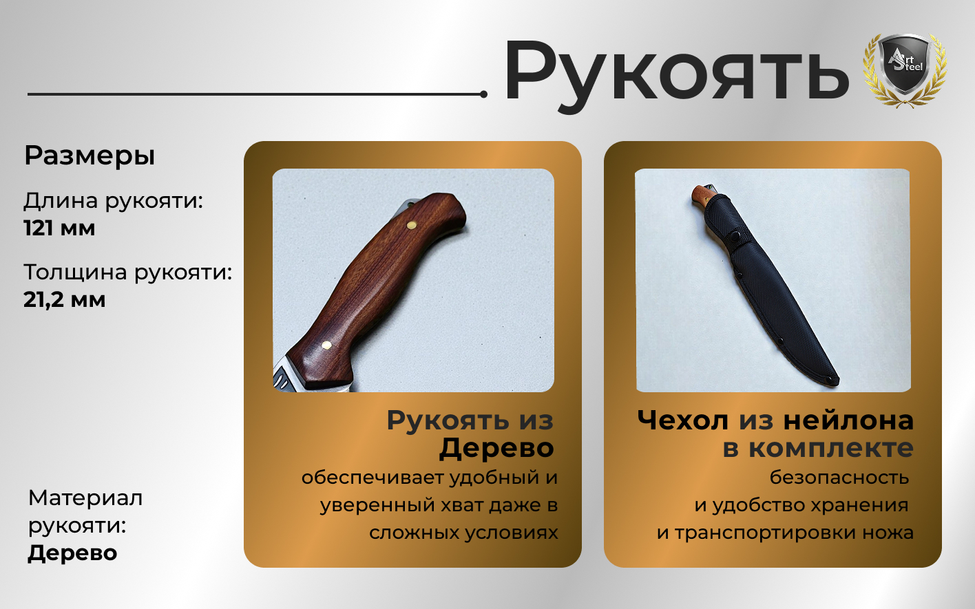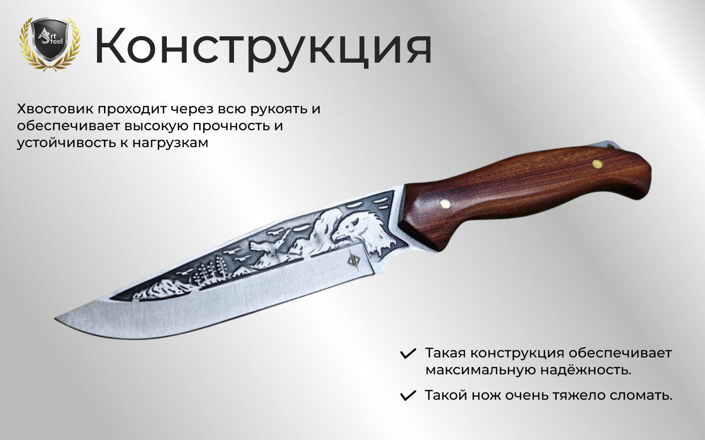 Рукоять с деревянными накладками обеспечивает удобный и уверенный хват даже в сложных условиях. Конструкция ножа цельнометаллическая, что гарантирует надежность и устойчивость к нагрузкам. Для удобного ношения предусмотрено отверстие под темляк.