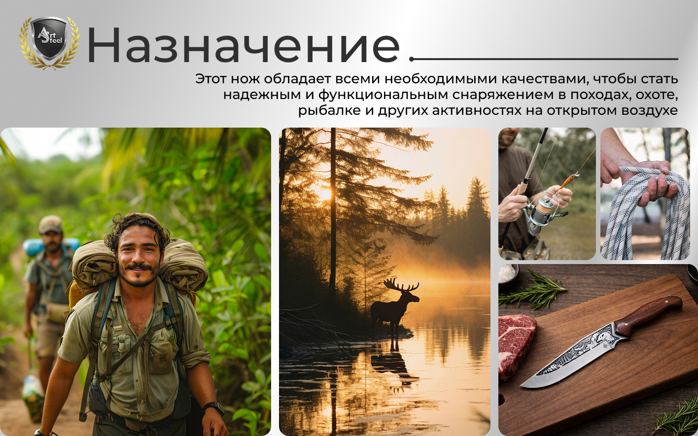 Клинок изготовлен из нержавеющей стали 40X13 с твердостью 56–58 HRC, что обеспечивает прочность, долговечность и легкость в уходе. Форма Clip Point позволяет выполнять точные и аккуратные работы, будь то разделка добычи, подготовка рыболовных снастей или бытовые задачи на природе.