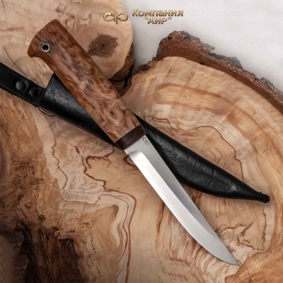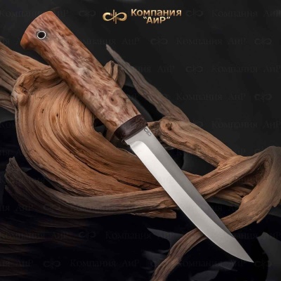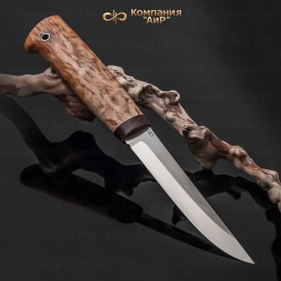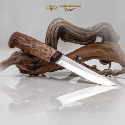 Рукоять из карельской берёзы отличается прочностью, природной красотой и удобной эргономикой. Она надёжно ложится в ладонь и обеспечивает комфорт при работе. Расширенная головка помогает быстро извлекать нож из ножен и делает хват более уверенным. Конструкция выполнена во всадном, неразборном монтаже, с отверстием под темляк на навершии.