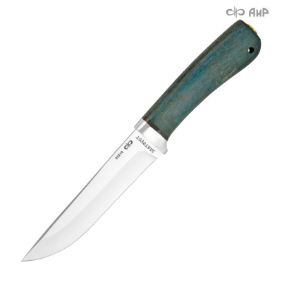 Рукоять выполнена из стабилизированной карельской берёзы — прочного и влагостойкого материала с уникальным природным рисунком. Благодаря стабилизации древесина не боится влаги и перепадов температуры, сохраняя красоту и долговечность. Эргономичная форма удобно ложится в ладонь, обеспечивая надёжный хват. Гарда средней величины защищает пальцы, а отверстие под темляк на навершии делает нож ещё практичнее. Конструкция — сквозной неразборный монтаж, гарантирующий прочность и долговечность.